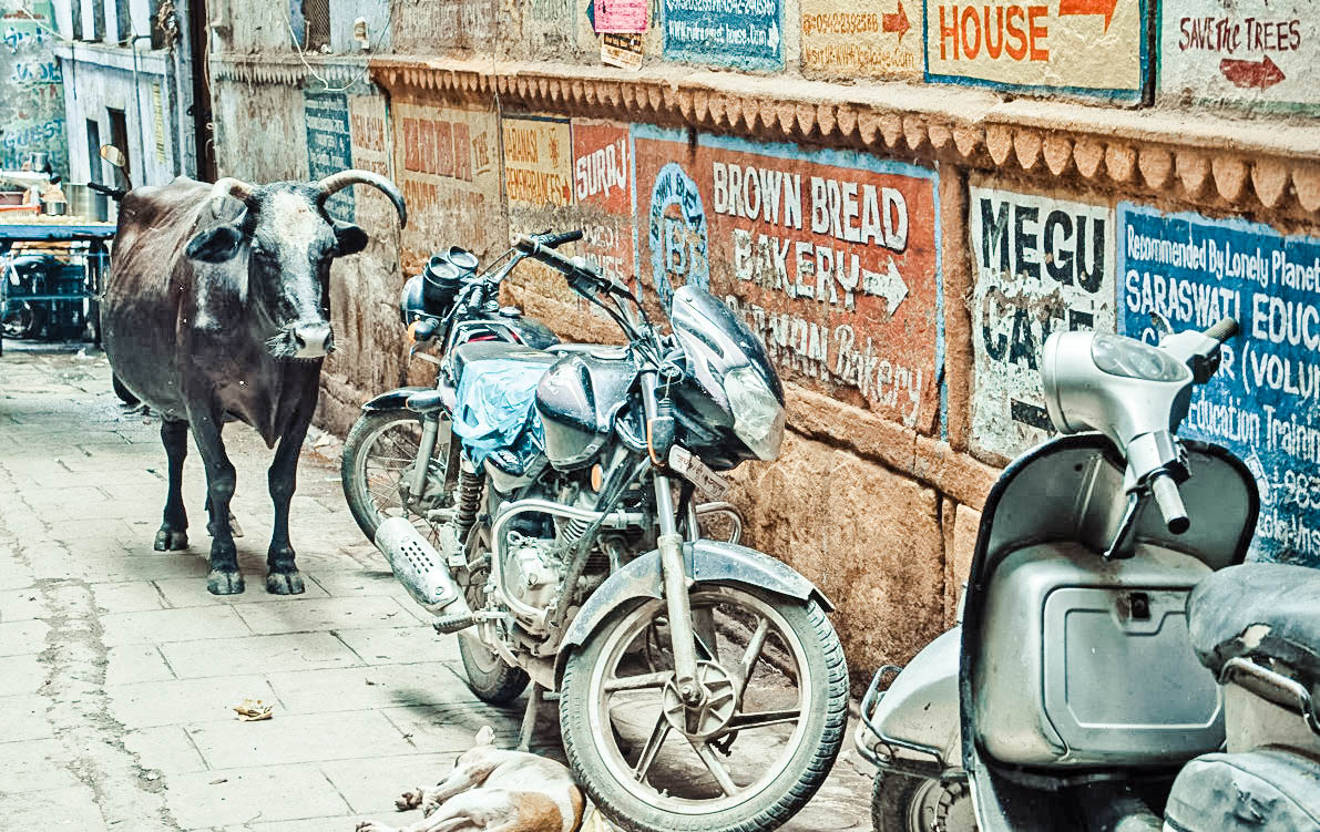 火车里整晚有个婴儿在哭闹。其实那哭声很纯粹,更像自弹自唱,还不懂生命里有多苦恼。抵达瓦拉纳西时,天朦亮,出了火车站就感到这古老城市的阵阵阴冷迎面而来。肩客们倒是早起,个个围上来要从我这早来客人的身上赚点钱。其实来过多次了。四处还是印度城市熟悉的味道;茉莉掺着灰尘,万寿菊花环混着垃圾,羊奶油在小摊上煎着甜饼,混合着河边火化场的焦尸气味。