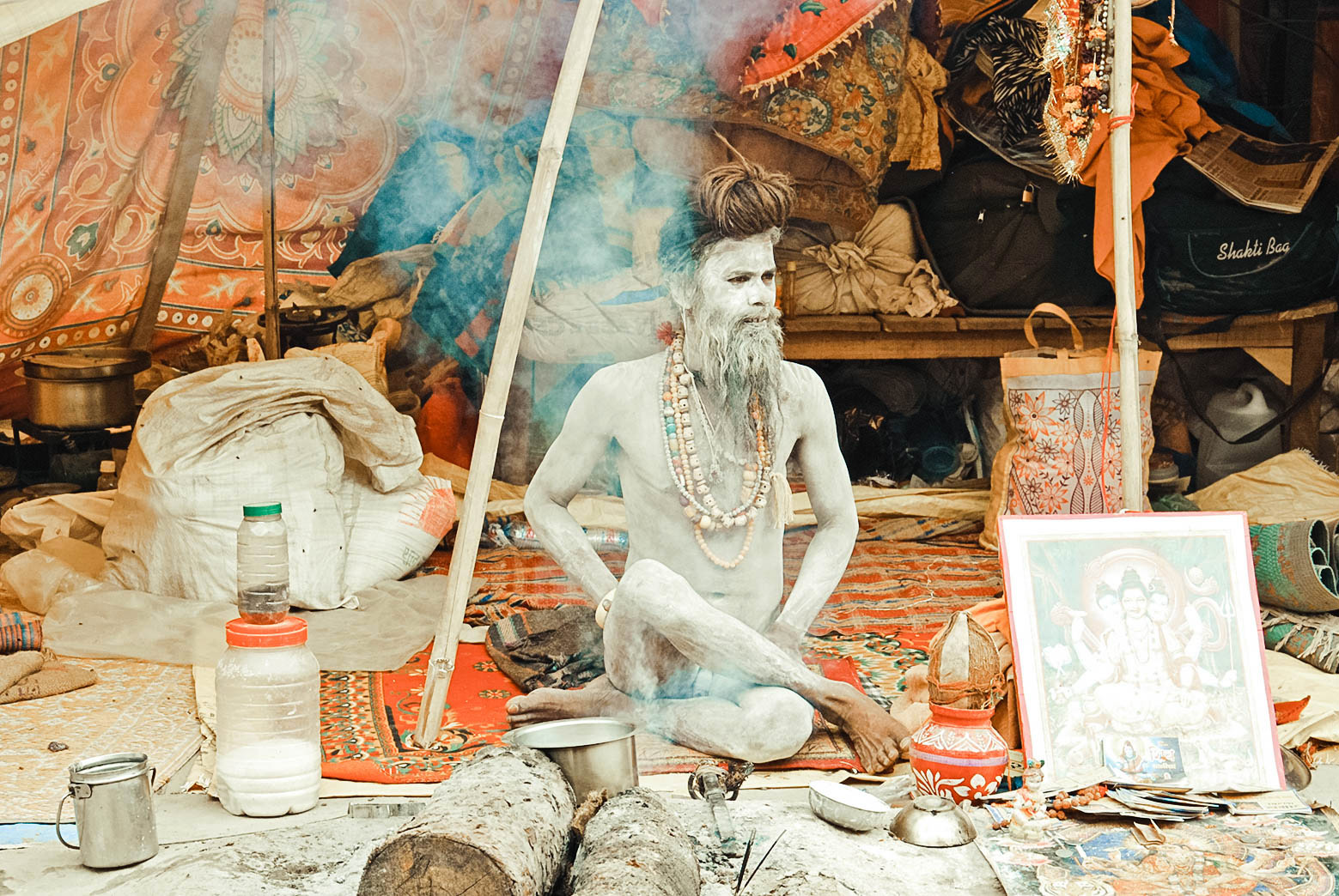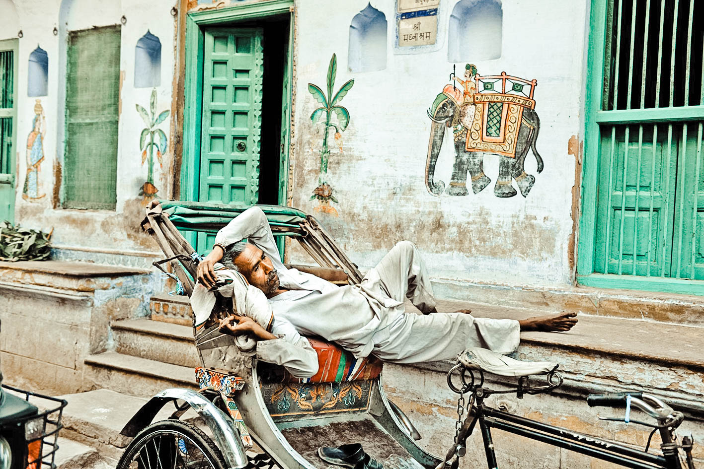 几位苦行者,挨靠在庙宇的巨柱影子后面睡觉了,柱子顶上有咕咕声的鸽子。瓦拉纳西的日子在喧闹艳丽中拉扯狂转,瓦拉纳西的夜晚,在鲜艳的背后,堆积着苍凉。