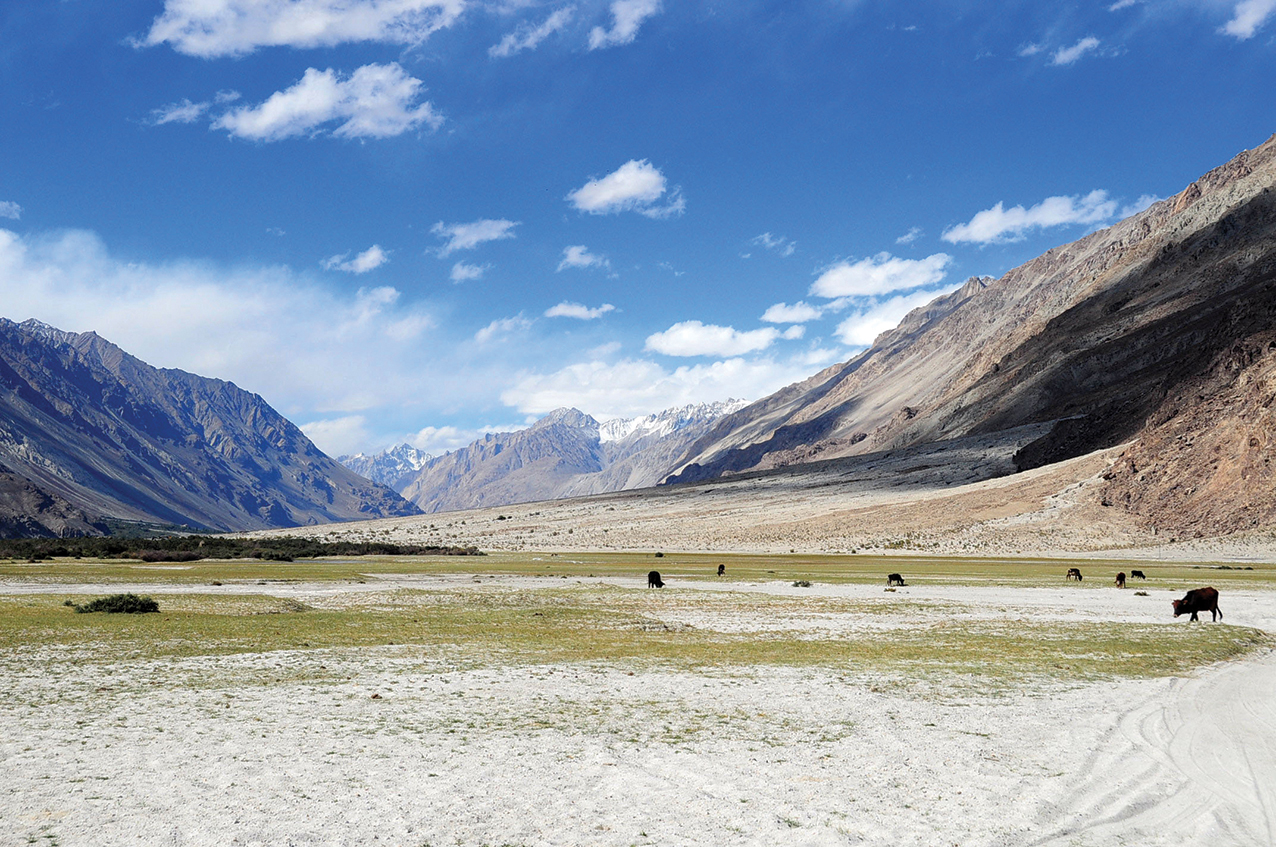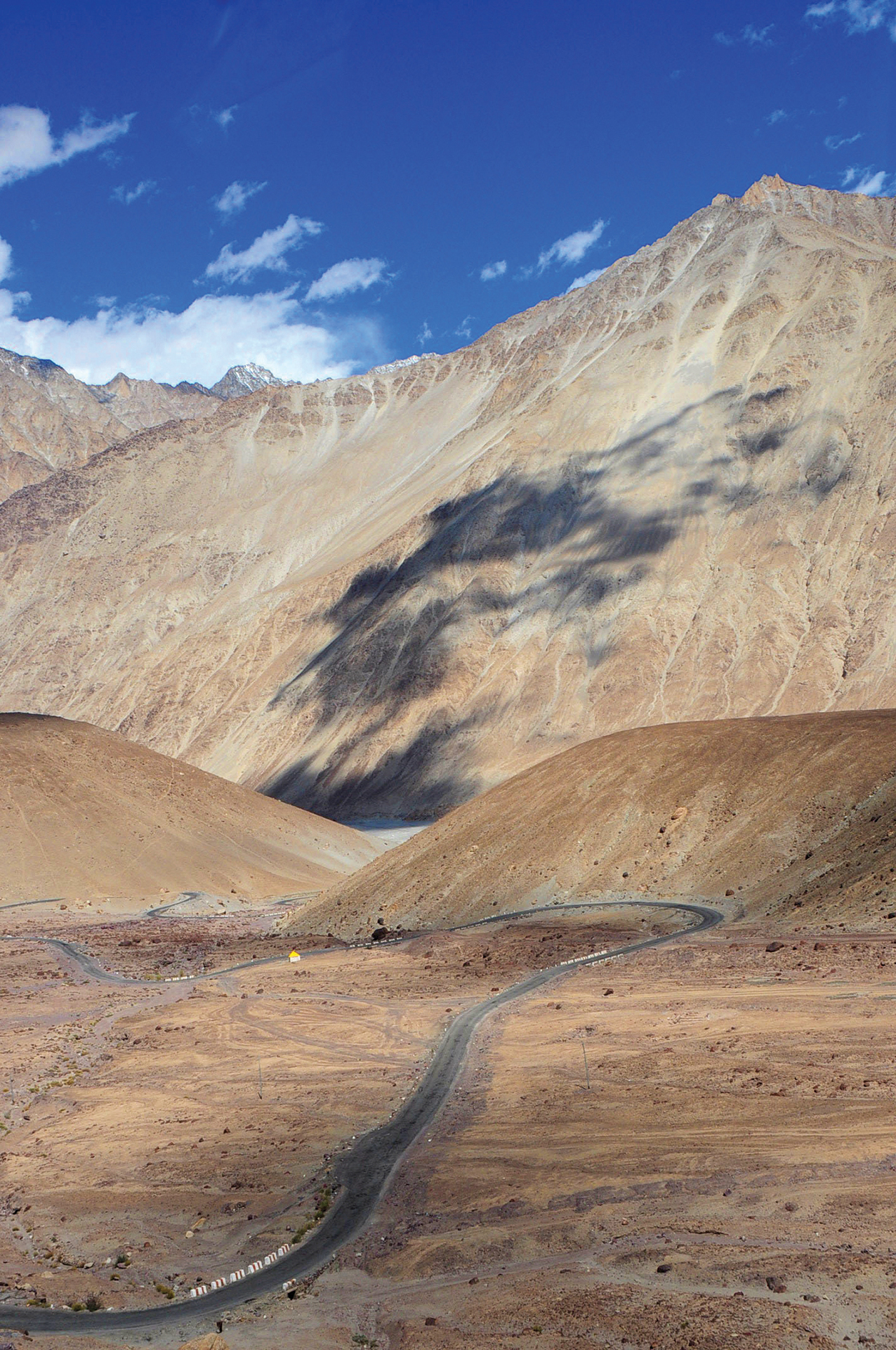 怒布拉山谷位于列城北部,车子会经过Khardung la隘口,就算正值盛夏,山体两岸依旧有积雪,海拔5602米,据说是全世界第一高的可通车的隘口。在努布拉山谷间,竟然会有沙漠,凝固大地的波澜蔓延,任由风来雕刻,为大地带来更为生动的花边,看似精致不动的沙漠,其实无时无刻不在随风舞动,改变不同的姿态。