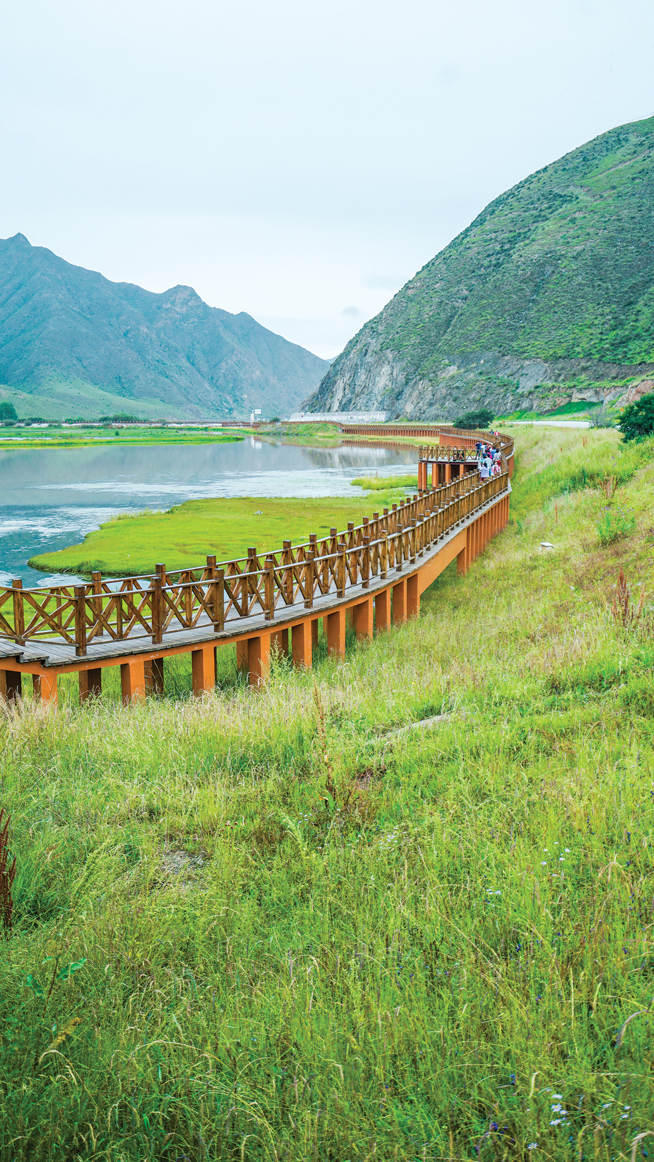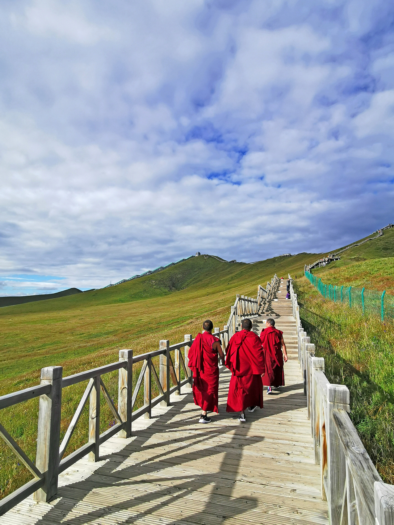 我们乘搭号称亚洲最长、总14节共538米高的“天边云梯”上到索克藏寺后山坡海拔3610米高的观景台,黄河九曲第一湾的雄伟景象即跃入眼底。俗语说:“天下黄河九曲十八湾”,这“九曲”就是唐代对青海贵德以上黄河段的称呼。远眺一望无际的大草原伴着似飞天飘带的黄河第一湾,正如李白所说的“黄河之水天上来”,沿着登山栈道往下慢慢走,极目望去黄河婉蜒折北而逝,草连水,水连天,天苍苍,野茫茫,让我内心对这山河大地的壮丽辉煌感动不已。