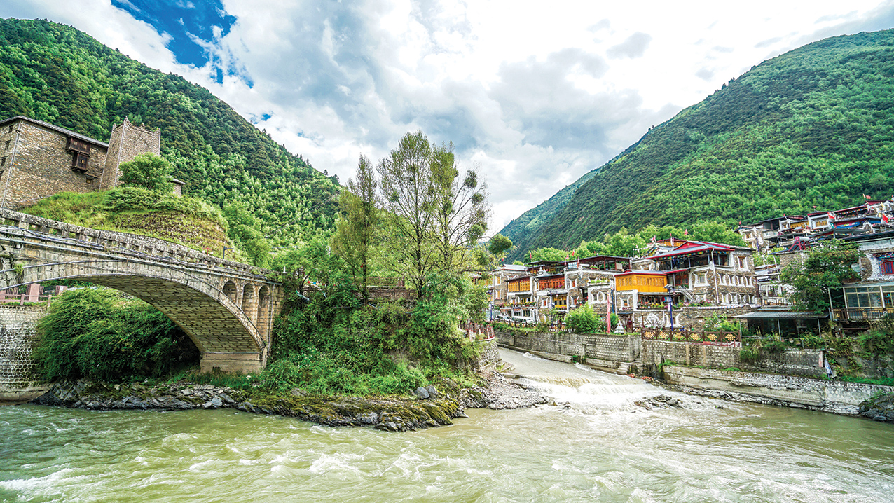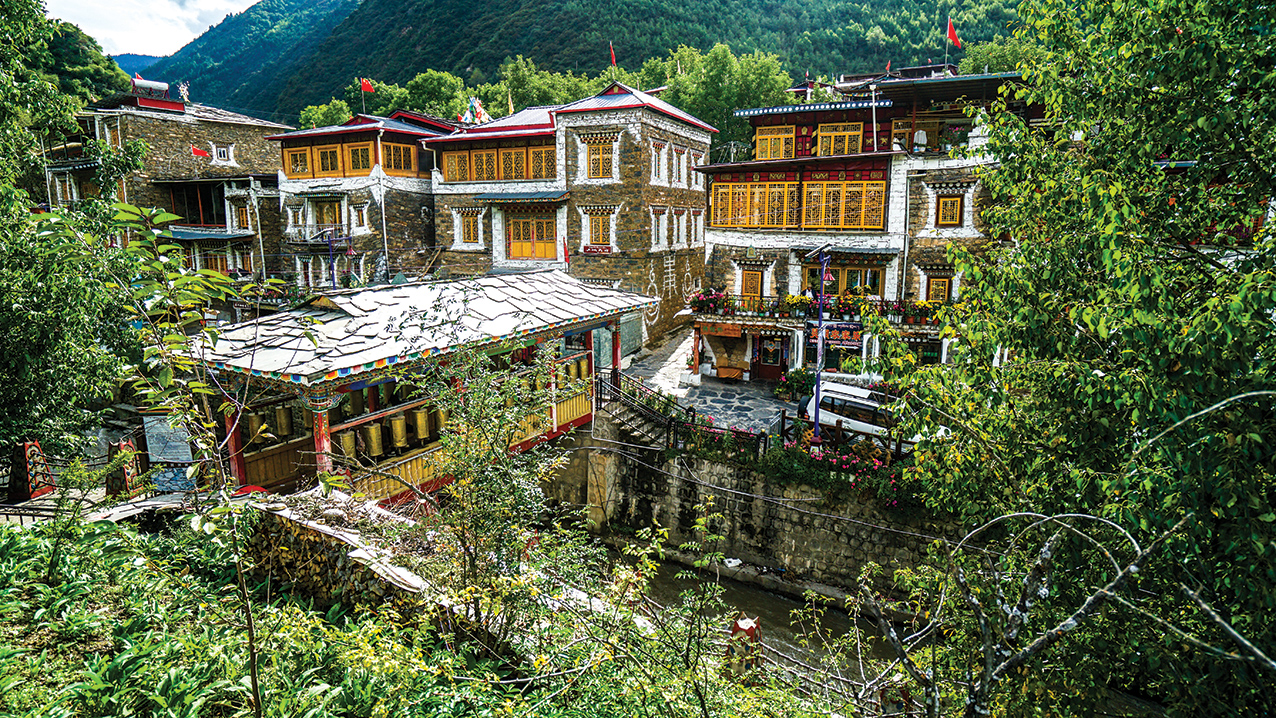 镇中心有两条小马路,两边建筑都是藏式风格,中心的马路两段铺设了不同颜色的石板,两种石板之间便是省界,可以在这里体验“一步跨省”的神奇体验。