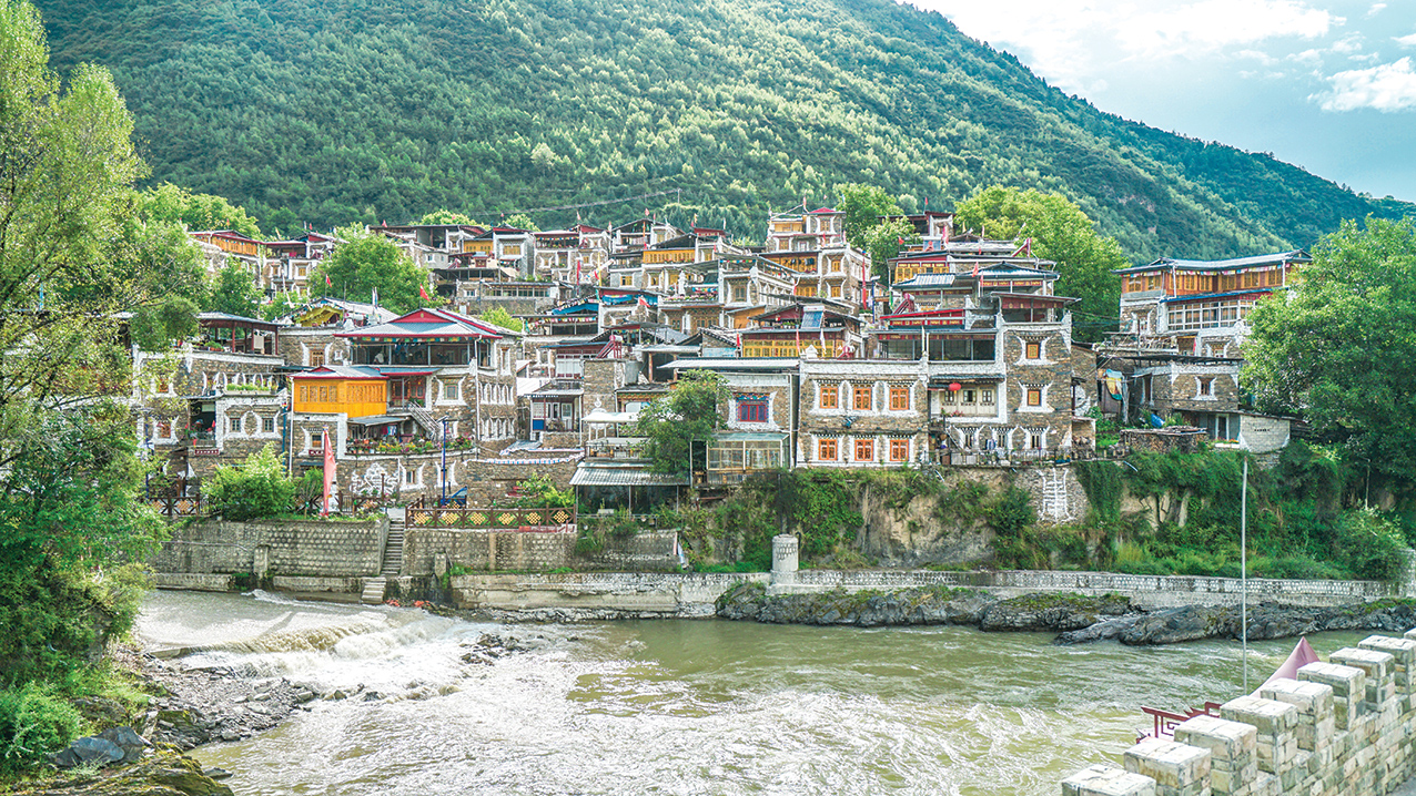 ◆ 卓克基土司官寨在阳光下色彩斑斓错落有致。