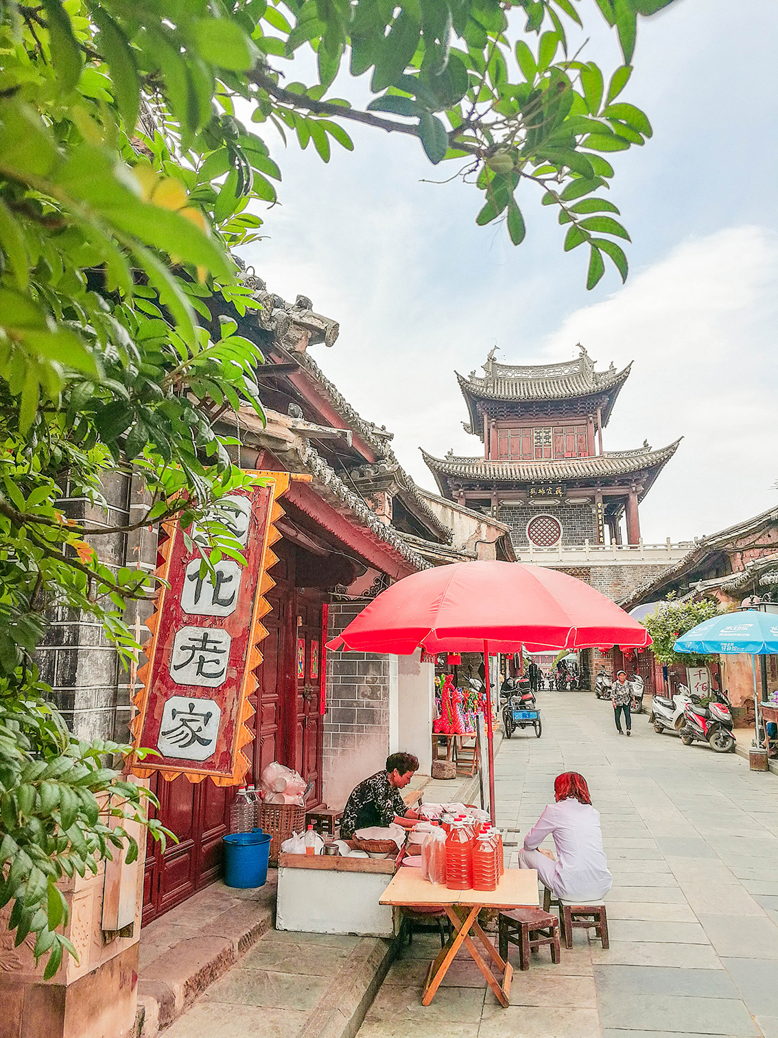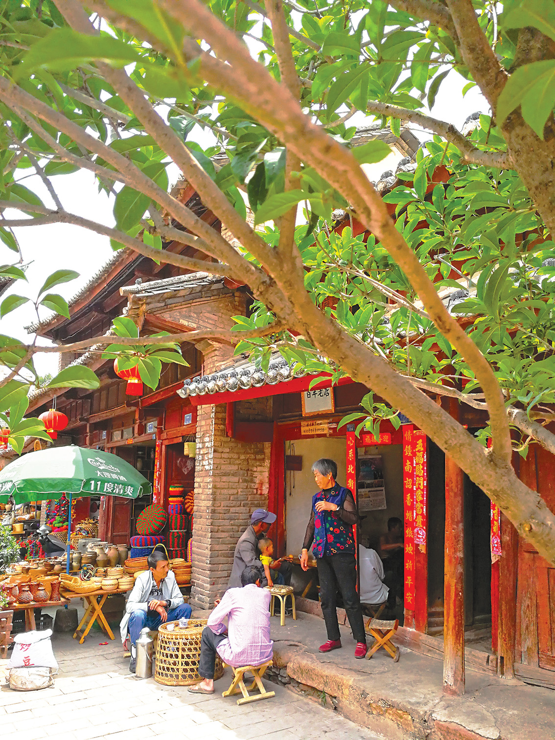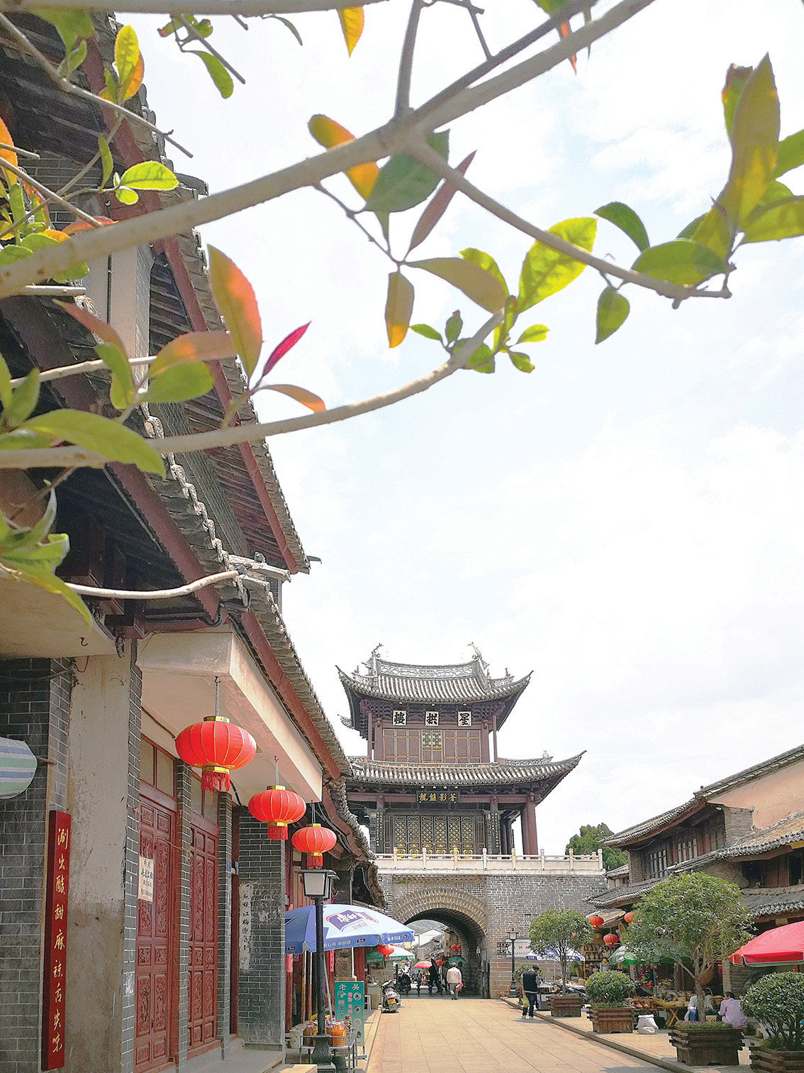 街道上的房子,底层一律是店铺,临街的门面都是木质的。小店的主人,悠悠地坐在草墩上,也不在乎身边的铺子是否有生意。三五成群的老人们悠闲地坐着,围着小方桌吃茶下棋,看街上的热闹。古街上,原来有背著书包的、挑着蔬菜的、提着鸟笼的、甩着空手的……人们从古楼的门洞穿梭而过,来来往往行走于古街上。岁岁年年,热闹的景象似乎在这古街上定格。
