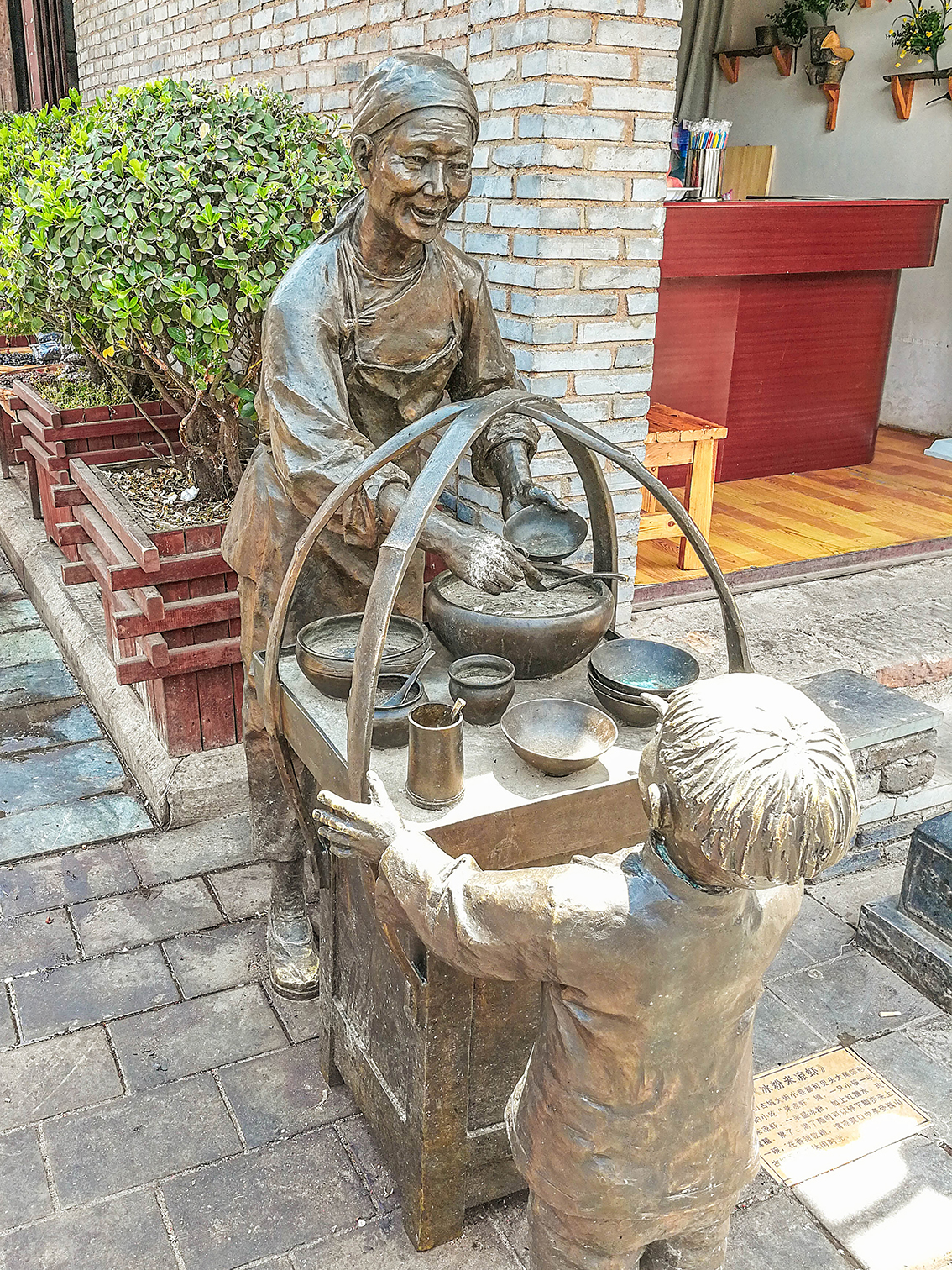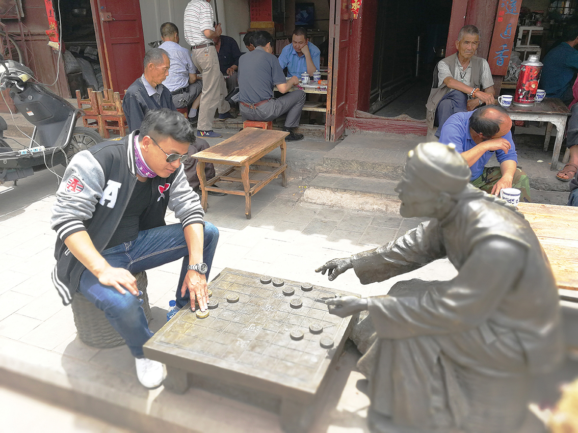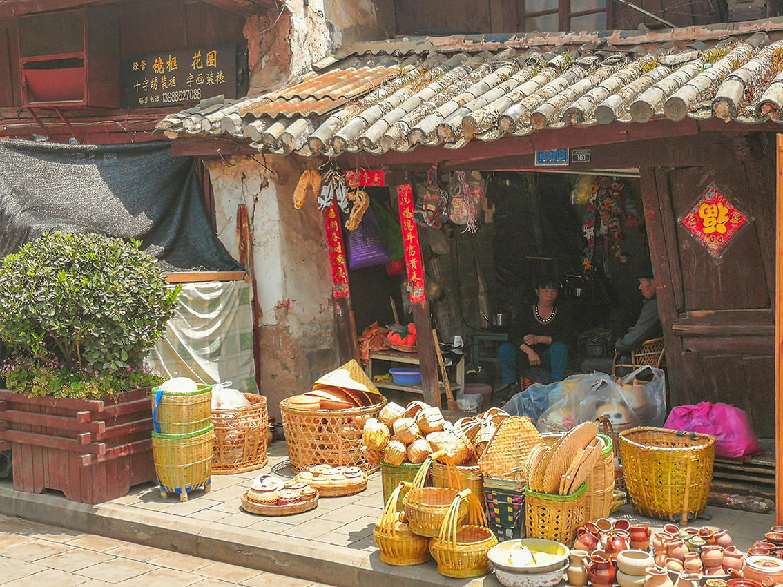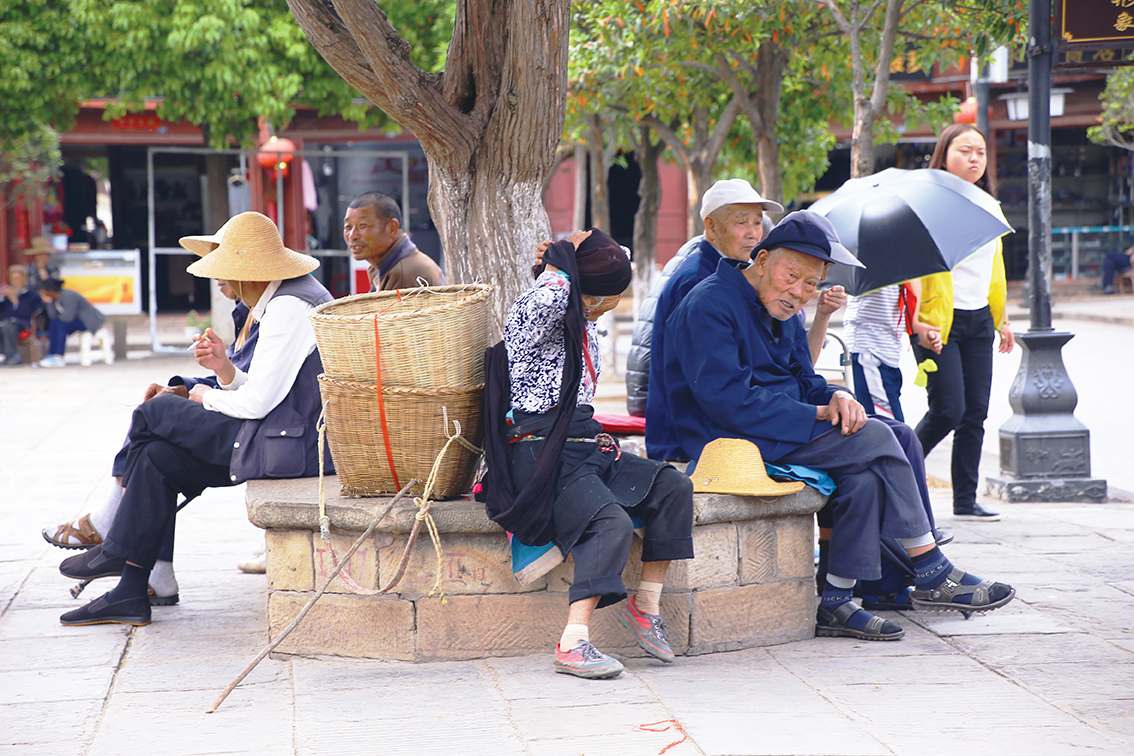 街道上的房子,底层一律是店铺,临街的门面都是木质的。小店的主人,悠悠地坐在草墩上,也不在乎身边的铺子是否有生意。三五成群的老人们悠闲地坐着,围着小方桌吃茶下棋,看街上的热闹。古街上,原来有背著书包的、挑着蔬菜的、提着鸟笼的、甩着空手的……人们从古楼的门洞穿梭而过,来来往往行走于古街上。岁岁年年,热闹的景象似乎在这古街上定格。
