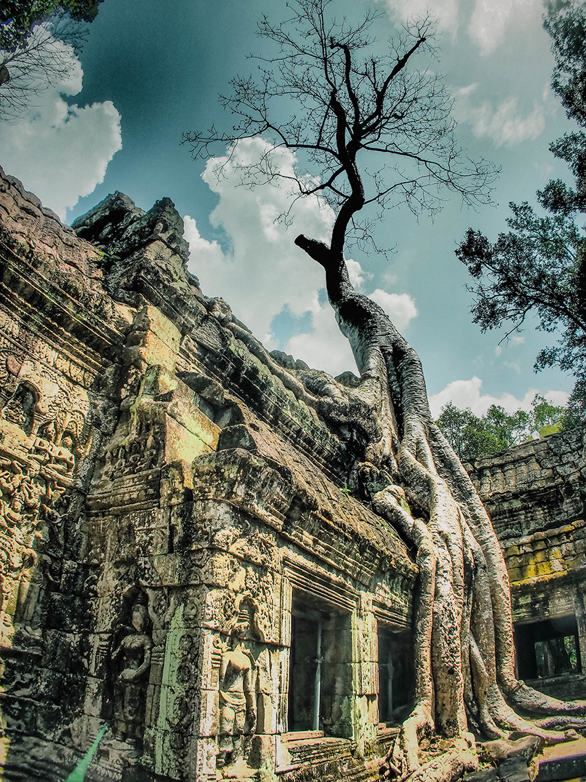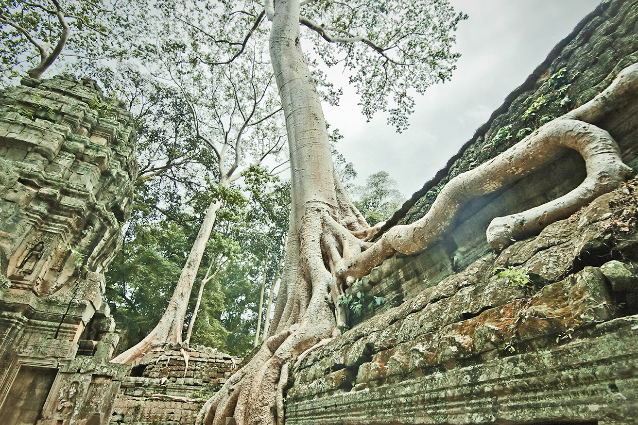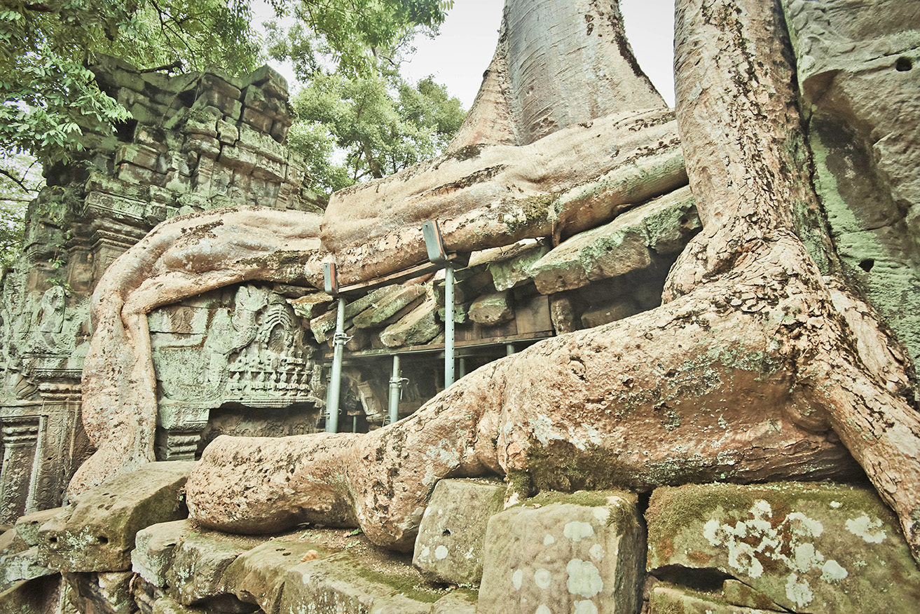 我们在神庙的入口处看到了塔布隆寺整修前后的照片,不得不惊叹维修团队的付出,若不是有对比照片还真的看不出来。我们随着导游穿梭在人群之中,游客们都在各大树下排队拍照,这些巨大的木棉树或绞杀榕的树根与塔布隆寺痴痴缠缠,木棉树粗大的树根往往可以包裹着整个寺院,而绞杀榕则寄生在树干之中,最后喧宾夺主。