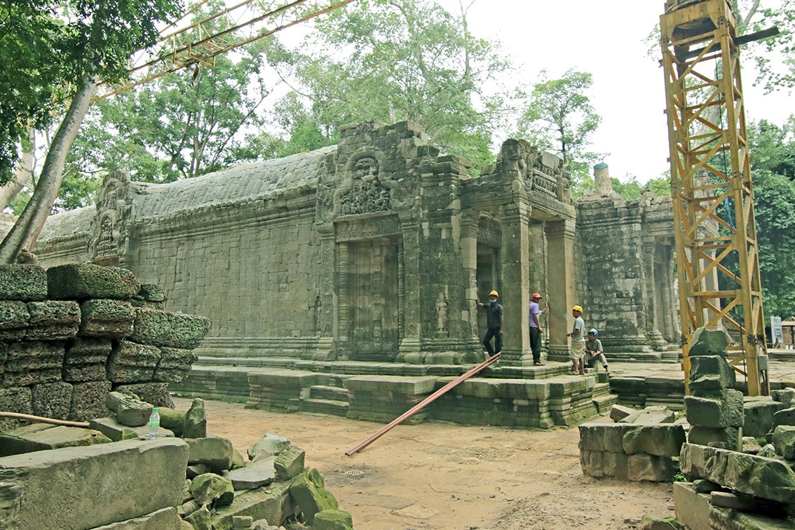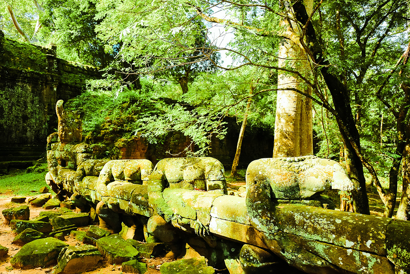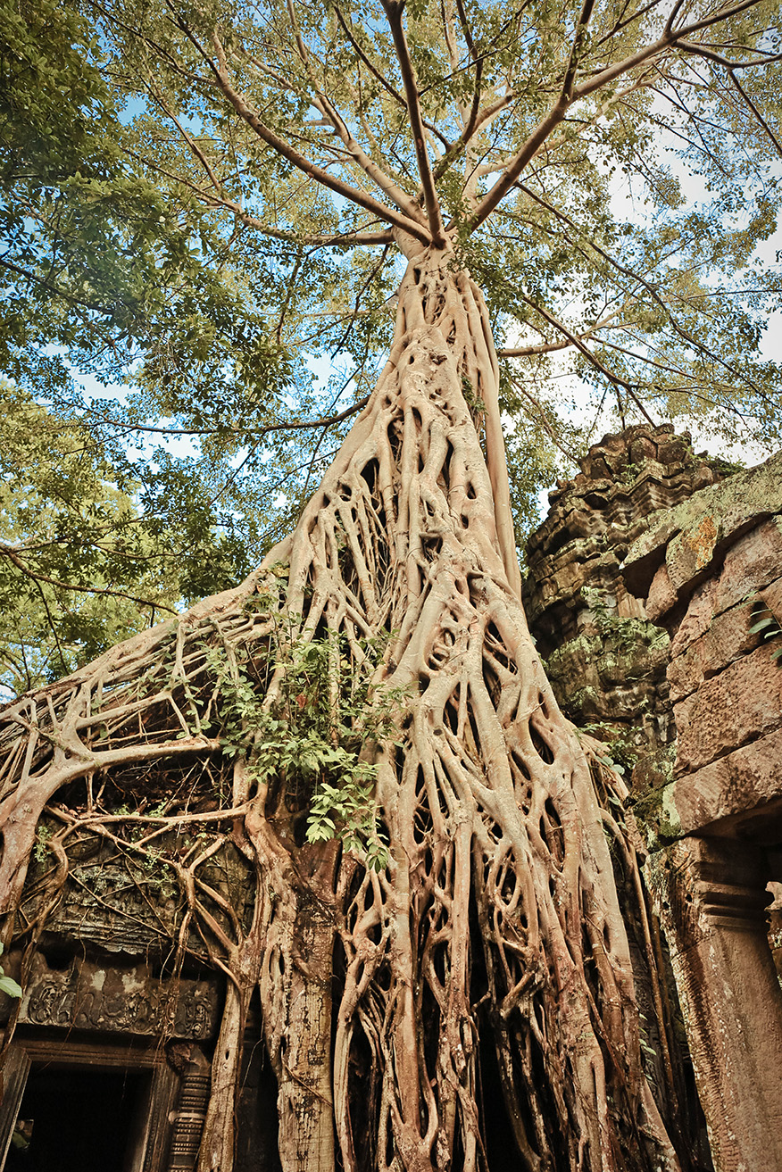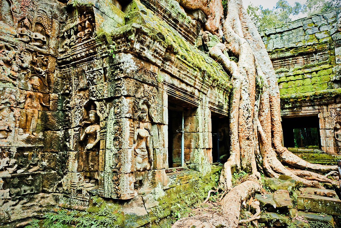 我们在神庙的入口处看到了塔布隆寺整修前后的照片,不得不惊叹维修团队的付出,若不是有对比照片还真的看不出来。我们随着导游穿梭在人群之中,游客们都在各大树下排队拍照,这些巨大的木棉树或绞杀榕的树根与塔布隆寺痴痴缠缠,木棉树粗大的树根往往可以包裹着整个寺院,而绞杀榕则寄生在树干之中,最后喧宾夺主。