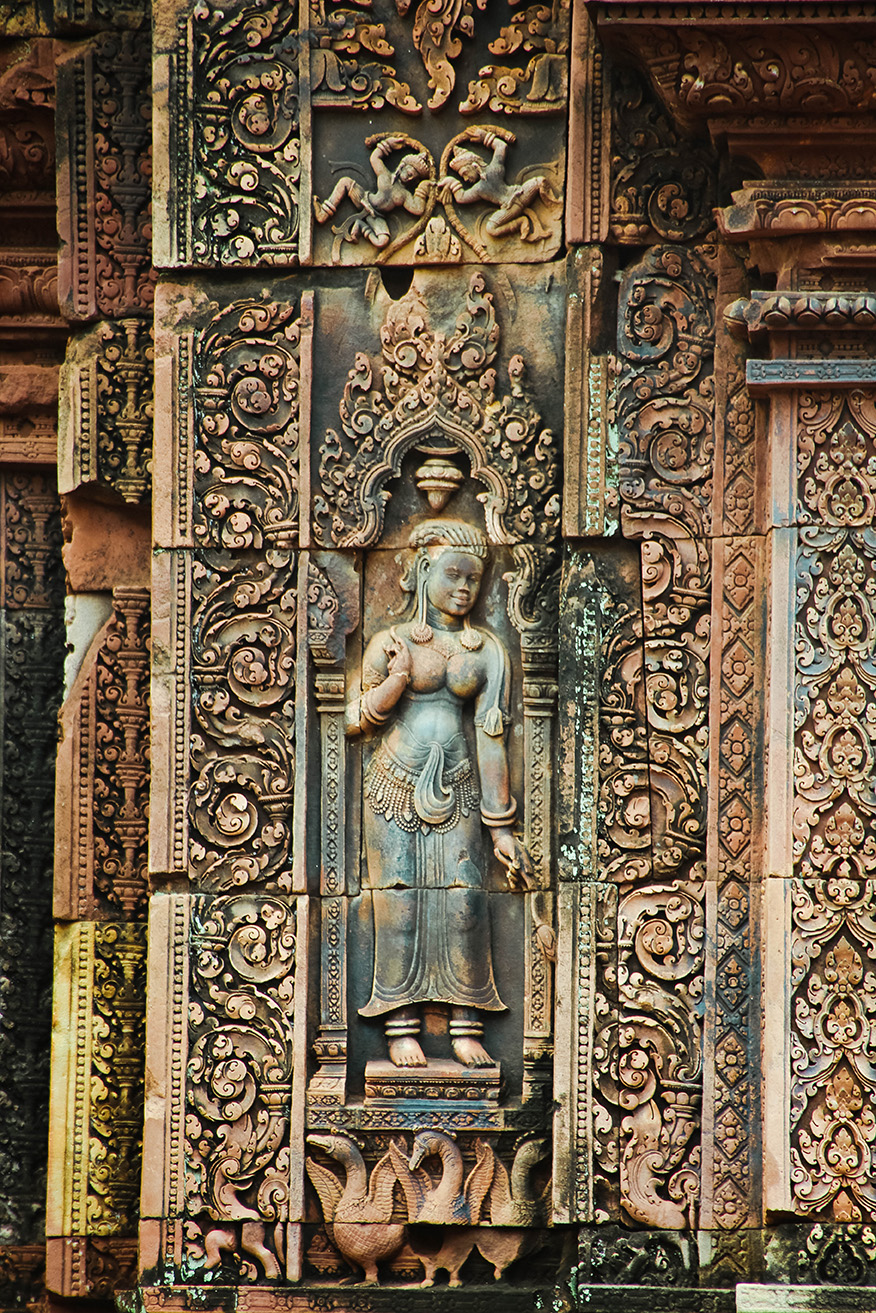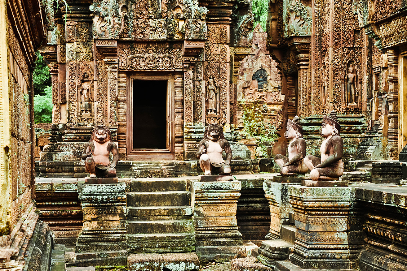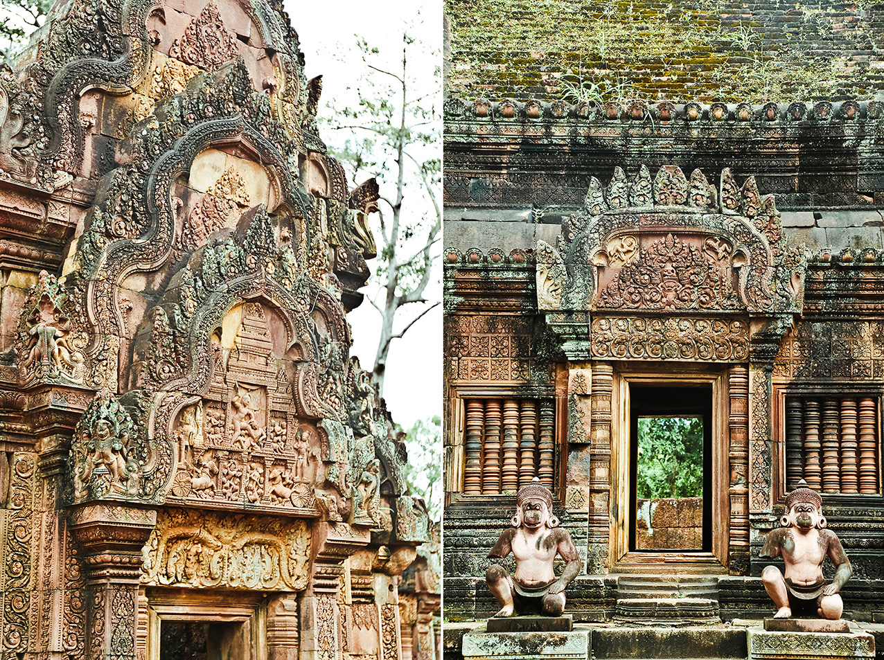 Banteay Srei班蒂丝蕾会被人误以为是君王收纳缤妃佳丽的后宫,如此柔美贵气的名称,却原来是高僧行经而过的廊道,而那寺塔则是他们引经据典的藏经阁。