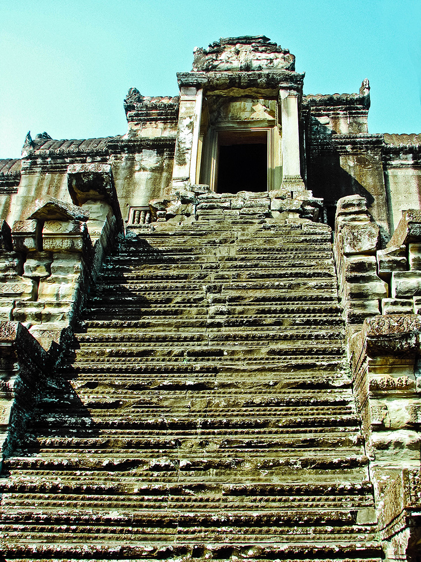 来吴哥窟的目的就是要上“天堂”,否则就是白来吴哥窟了。所谓的天堂也就是吴哥窟的第三层平台,即最内和最高层平台,称为巴甘,呈正方形有如金字塔一样。据说古时的臣子要从左边75 度的陡梯五体投地的爬上去,而国王则从中间 45 度的阶梯爬上去以示虔诚。