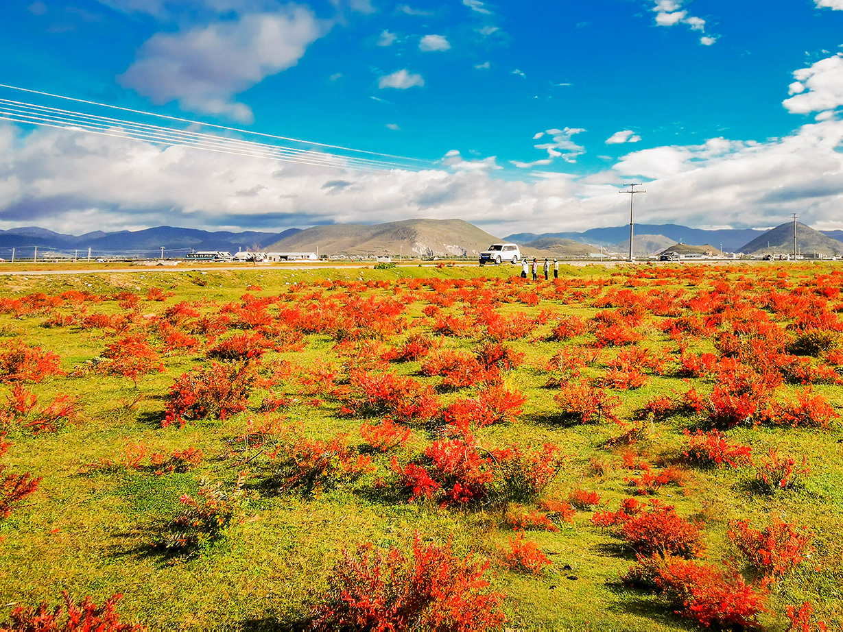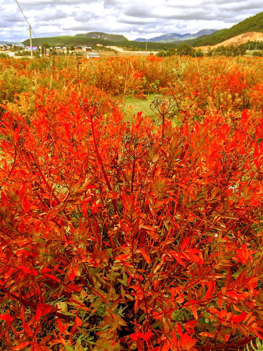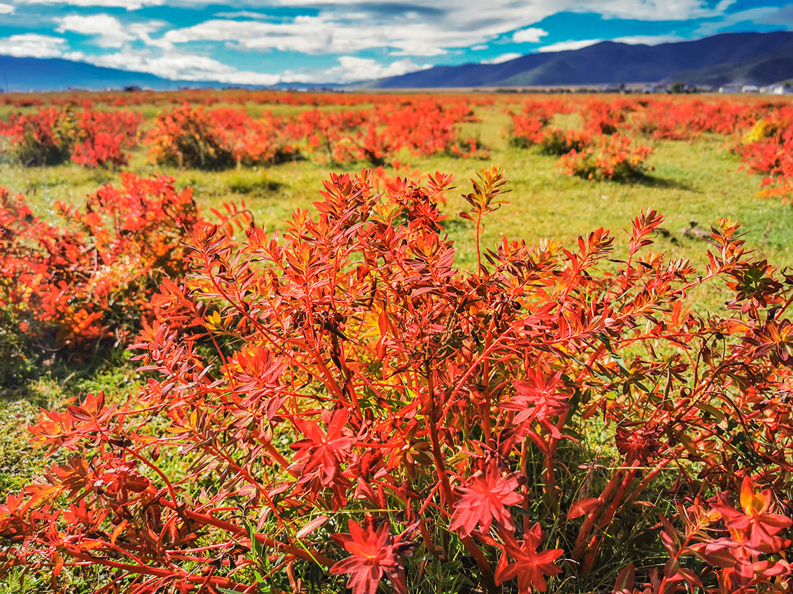 狼毒花又叫火柴花,属瑞香科狼毒,每年6月绽放,花朵为黄色,到了8月下旬至10月上旬,即将枯萎的狼毒花全身就变成了火红色,从小中甸镇延伸至建塘镇,形成了50多公里的五彩缤纷,撩人心魄的连绵花海,酷似一张迎接远方客人的红地毯。