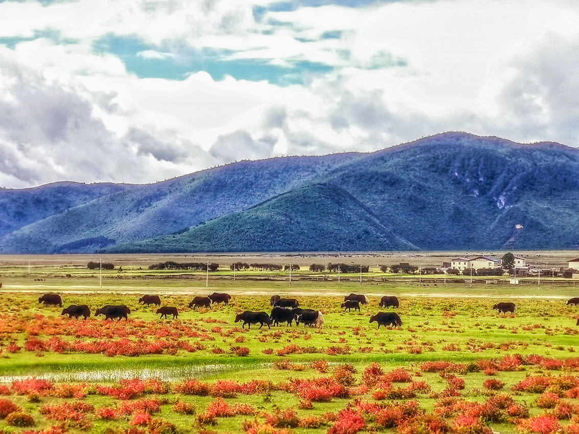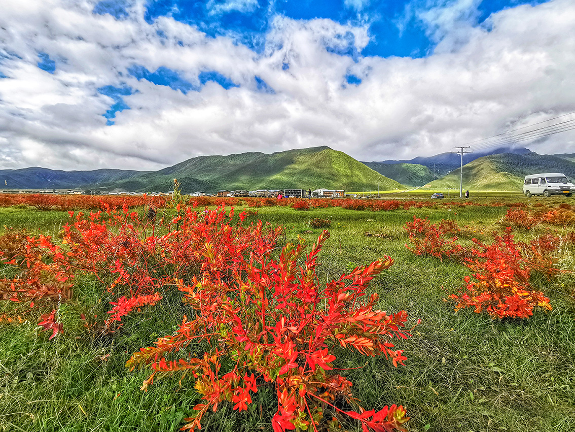 秋季是香格里拉色彩最丰富的季节,蓝天白云下,雪山环绕中,大小草甸点缀其间。“燃烧”的狼毒、静谧的湖水、浮动的白云,构成了浓墨重彩的美景。