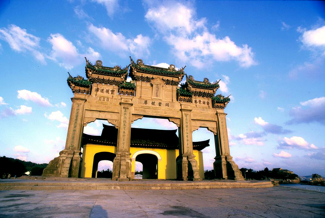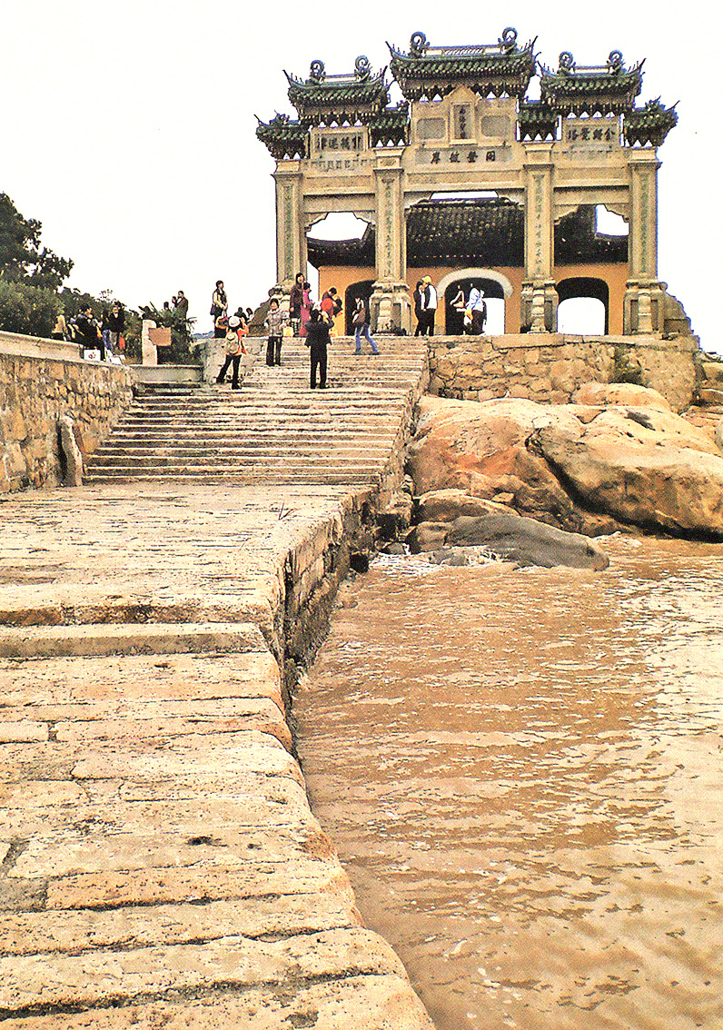 ◆ 乘船前往普陀山,早期的码头较小,已由现代化码头取代,但旧码头屹立“同登彼岸”的石碑坊,至今仍保留,成了亮丽风景线。(陈基球摄)