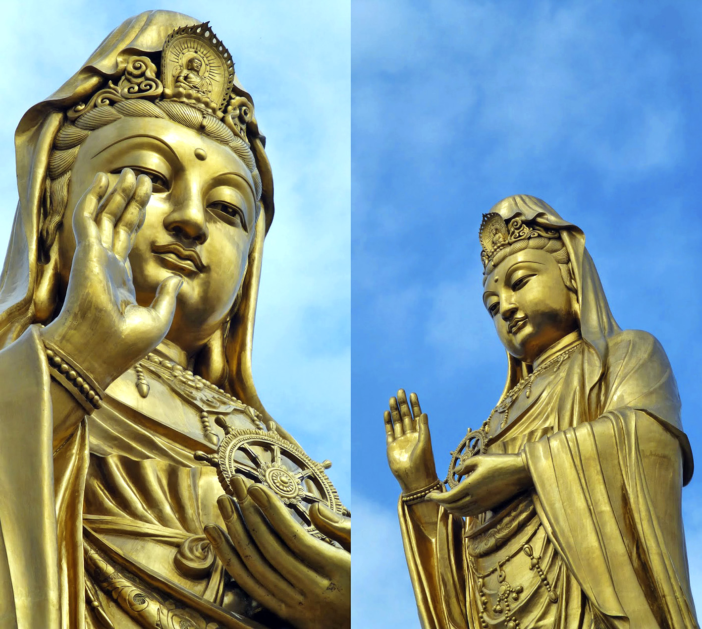 普陀山南海观音立像,的确妙相庄严,顶现弥陀,双目垂视,眉如新月,左手托法轮,右手施无畏印,显得大慈悲相。观音身高18米,莲花座高2米,三层座基高13米,总高度是33米,用亚金铜材铸造,由96块铜壁板组成,壁板厚10毫米,总重量70吨。观音的脸部 高2点65米,宽2点4米,含纯金6点5公斤,用打磨抛光法将焊接处磨得天衣无缝,精湛的工艺令人叫绝,被誉为当今世界观音铜像之最。