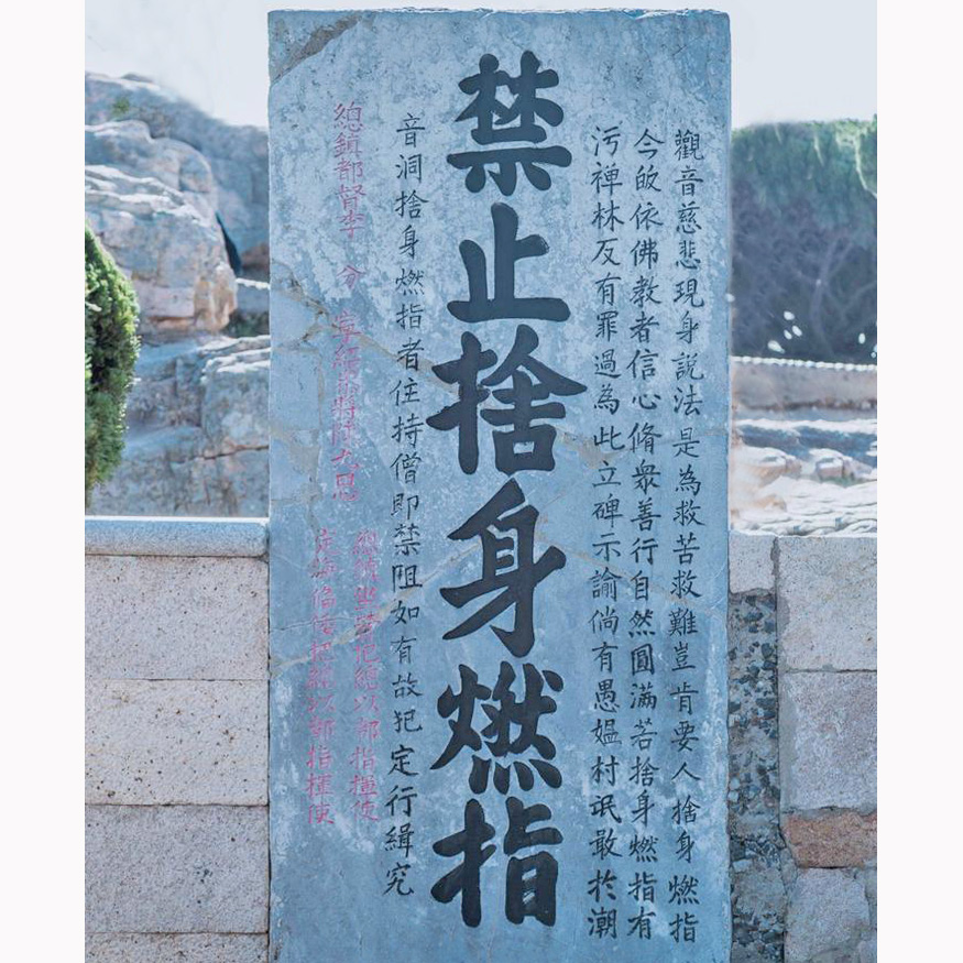 在“不肯去观音院”入口处的附近,矗立一块引人注目的石碑,上书“禁止舍身燃指处”,是明代万历年间官府所设。过去,有许多善男信女,用自己的手指当香烛,朝拜观音,以这种虔诚的方式求见观音现身,以求观音引渡到西方极乐世界去,也有人从崖上跳入潮音洞中。当时的明朝定海总兵为防止这种悲剧继续发生,就竖碑告示善男信女,不得违背观音菩萨大慈大悲、救苦救难的本意,劝人不要做此类傻事。