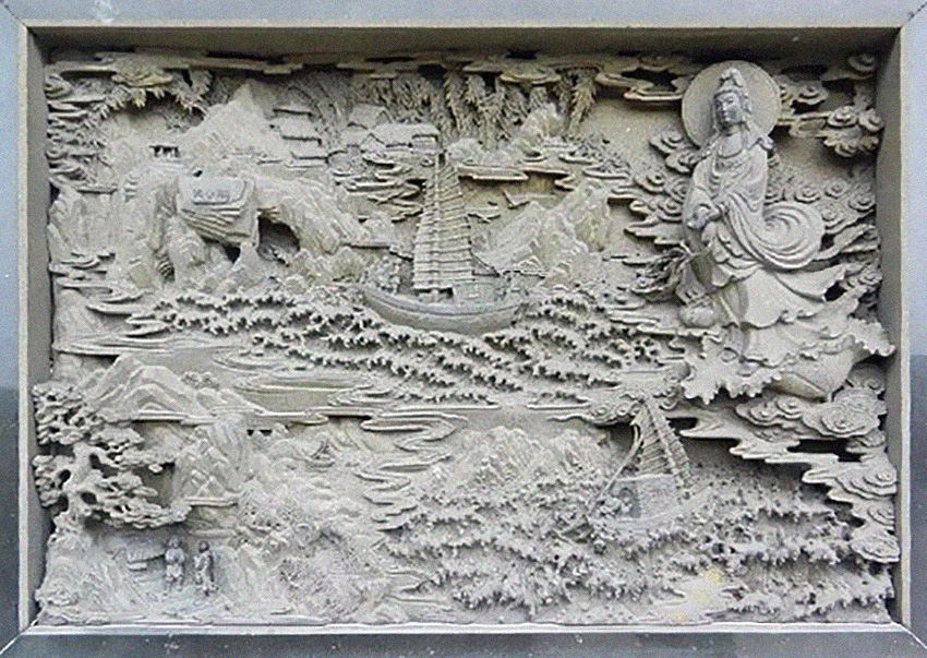 ◆ “不肯去观音院”大门粉墙上刻有“观音大士乘船遇大风浪,不愿离开普陀山”的浮雕。