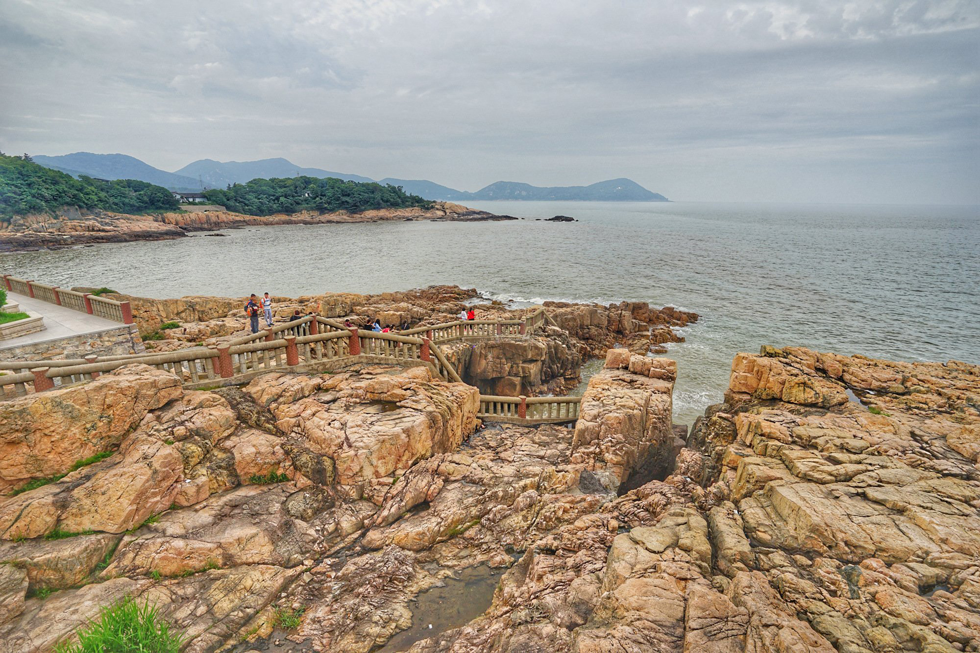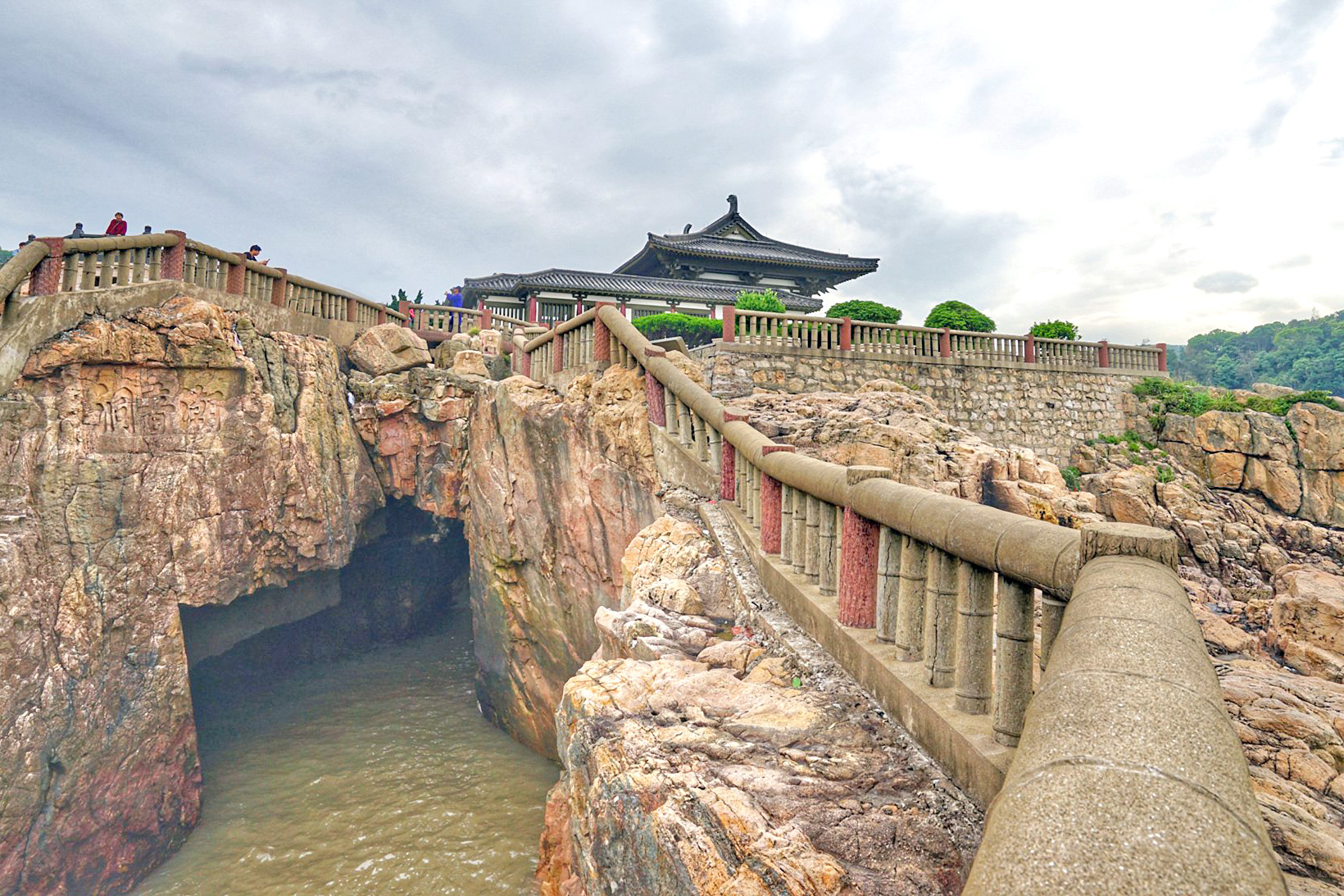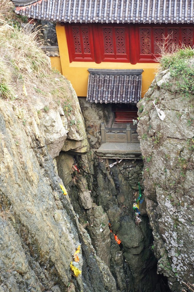 沿着石阶往下走,就到了“瞻圣阁”,阁分为两层,里头空间不大,顶多可同时容纳不超过20人在内礼佛。梵音洞正好与楼阁相对,洞深达80余米,宽3至6米,中间嵌一块巨岩, 宛若巨蚌衔珠,海潮日夜冲击,波涛像脱缰的奔马,飞涌入洞,而洞内经常传说有“大士现灵”,信则有,不信则无。