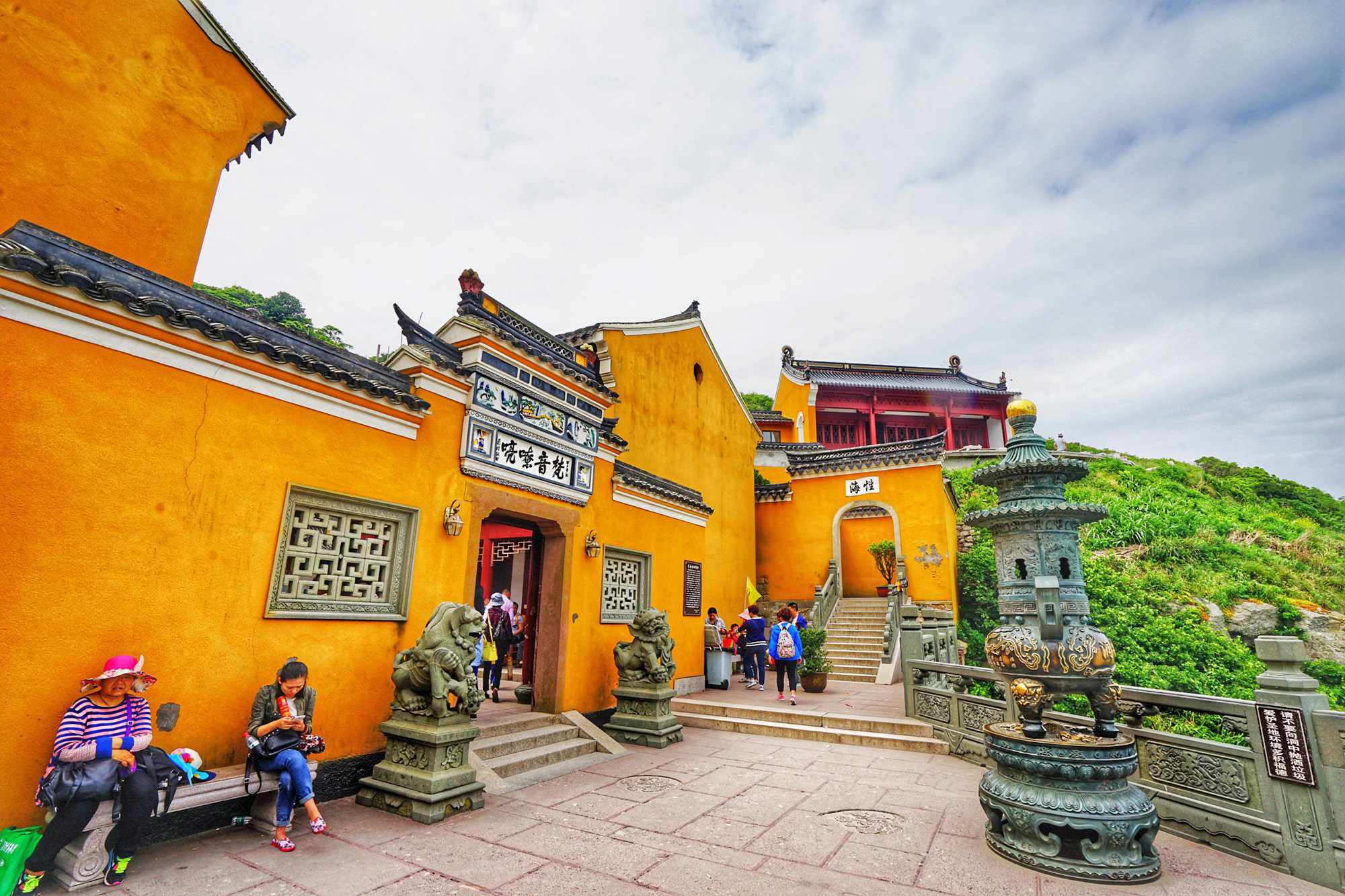 “梵音洞”也是屹立在临海的悬崖上,民间传说是观音大士灵现种种色相之处,比“潮音洞”更多。崖顶建有“梵音洞庵”,崖的正中平台上辟有“瞻圣阁”。