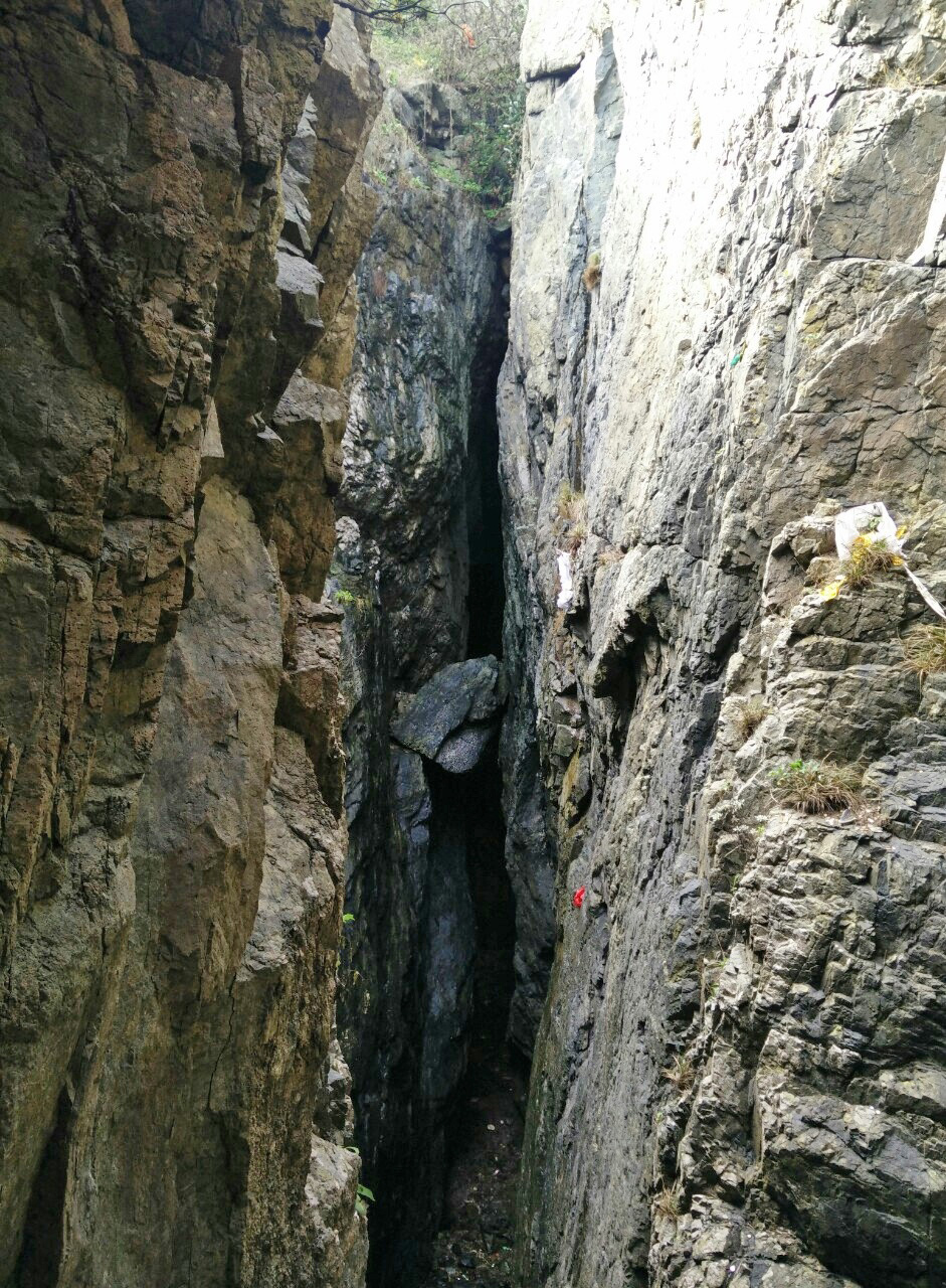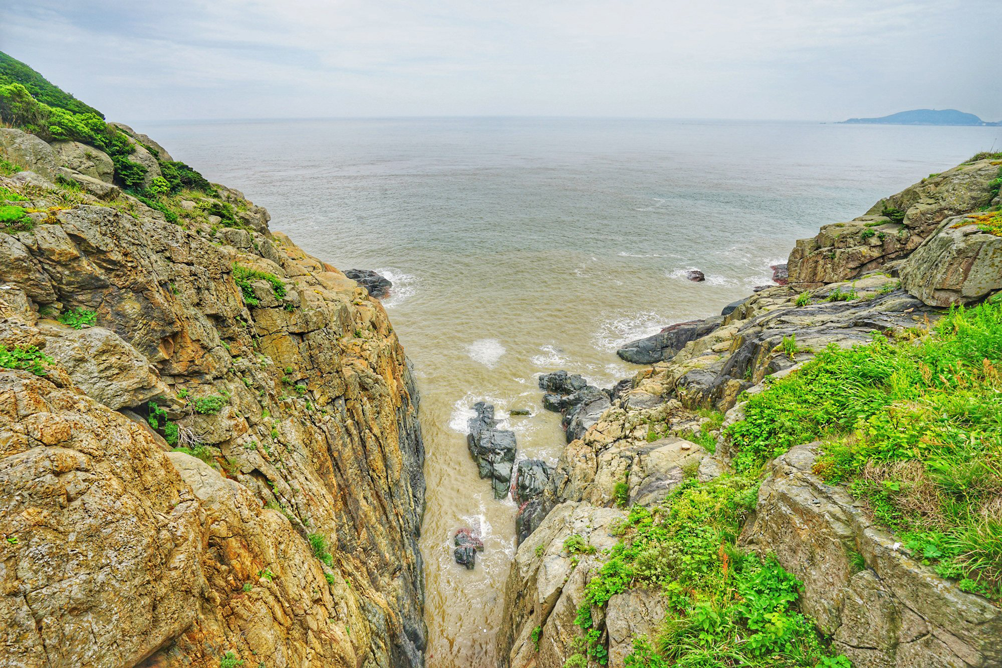 “潮音洞”是山石裂隙形成,从崖顶至崖脚,高数十米,潮水奔腾入洞,声若雷鸣,相传观音大士常在此处现身,所以洞顶石上刻有“现身处”三字。