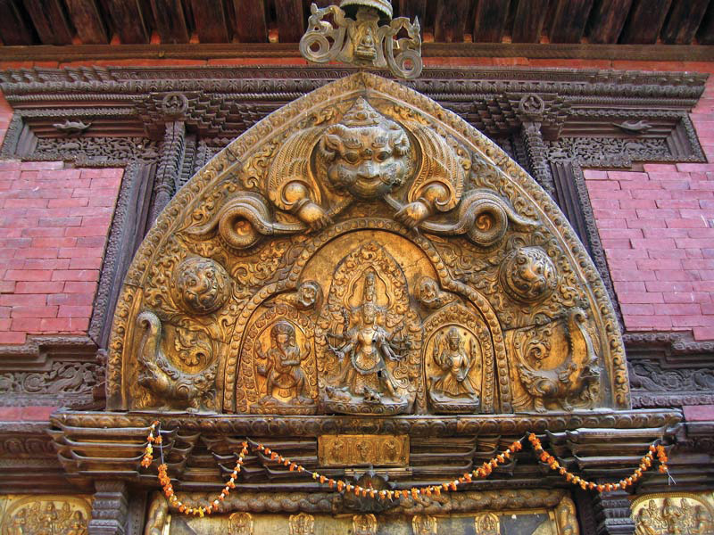 ◆ 铜铸兴都教神牌后面墙上的木窗型设计是藏式的,各样糅合,就是尼泊尔的加德满都。