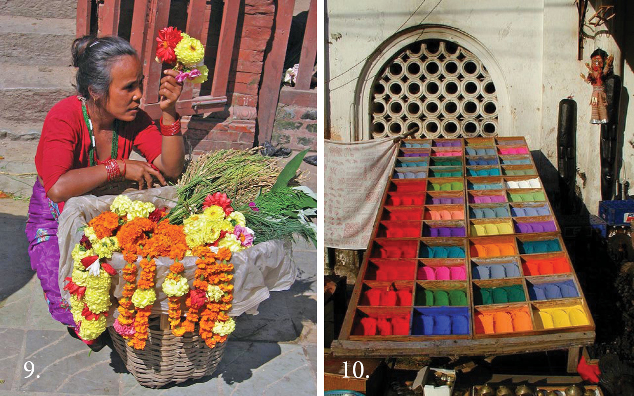 兴都主义是亮黄万寿菊,艳红玫瑰,乳色茉莉。这里的藏族密宗,是旗帜上的玲珑五色。佛教的庄严素色,则为木刻的褐,石块的白,金属的铜。而那人世色彩就更丰富了,常见任意反差的冲突,好无所谓的配搭,因为一切既来之则安之,因为既然来了,总能从中挖掘到这个配搭的美,关键就在于能接受与否。而这里是没有不能接受这回事的,就如整个加德满都你找不到两幅完全相同的唐噶佛画一样的道理。