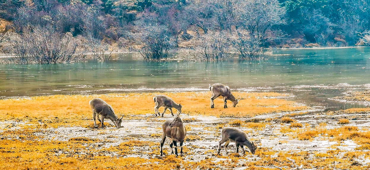 清澈的水流在金黄的草甸间蜿蜒流淌,湛蓝色的海子总是不经意间撩动着一路向往的人儿,季节的变幻并未影响水色,深邃而透亮,是海子的特点,蓝色象征着梦幻、纯洁,秋季的梦幻与纯洁,不正是那梦中的童话吗?