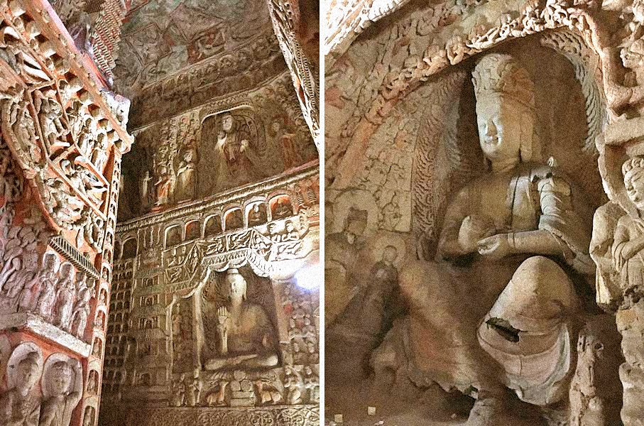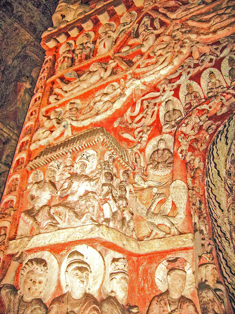 沿正门长驱直入,那窟前的四重楼阁特别显眼的,便是俗称『大佛窟』的第5窟了;与其毗邻的第6窟又称『佛母窟』,这双窟虽然游人不绝,却鲜闻人声喧闹的——即令导游面向旅游人群的滔滔说解,似也没敢拉开嗓子来扬声高谈。人声不喧,但这双窟的历史声息,感觉却异常地喧闹:它们交织着冯太后与献文帝两党之间的血腥权争,也应当杂糅有孝文帝对养育和提携他的冯太后以及生身父亲献文帝两者的复杂情感才是。