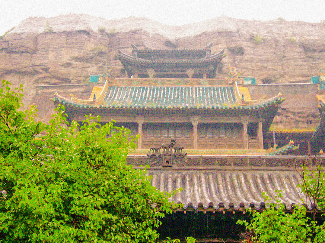 云冈石窟的雨中远眺,山势如剪,洞窟依然清晰可辨。