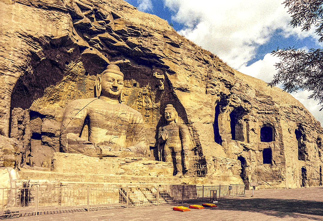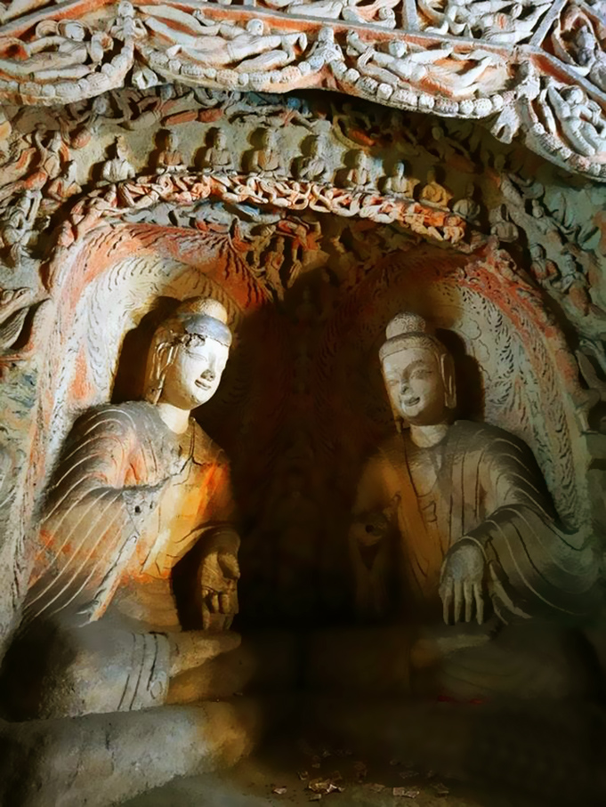 云冈石窟是北魏王朝磅礴史卷的前半部;其后半部,当然是迁都洛阳后接续开凿的龙门石窟了。凝定在大同市郊的,这仿佛毫无预警即嘎然休止的半部交响乐,其绚丽的高潮乐段,就在5世纪中叶开凿的这双窟了。