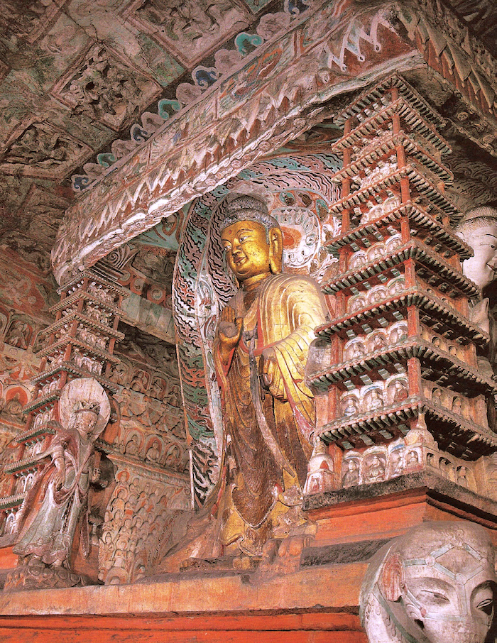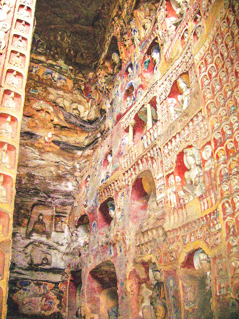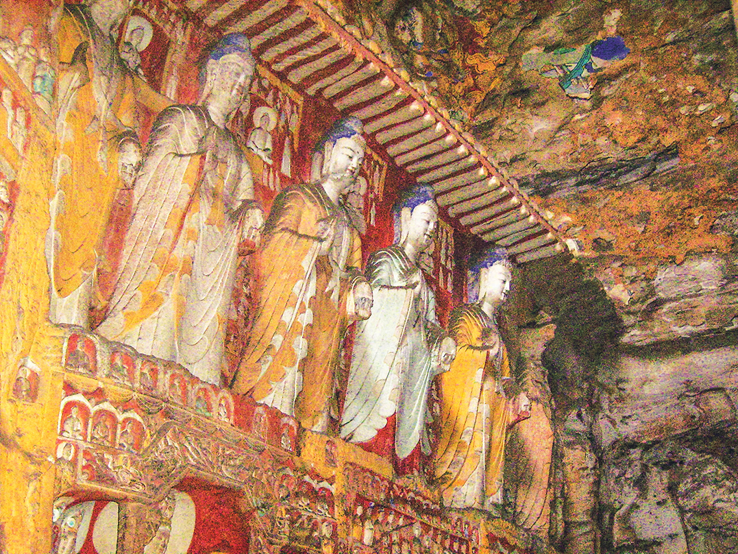 云冈的第七至第十窟是一组双窟,即第七和第八窟成一对,第九和第十窟则另成一对,此四窟并列而成一组,那是北魏朝同一个历史阶段的艺术遗珍了。就云冈艺术在历史时间留下的刻痕而言,这首创的双窟形制,还是稍后开凿之第五、六窟的先驱呢。然而,若按时间顺序而言,这双窟组合还应该是先有第十、九窟,接着再继续开凿第八和第七窟的。