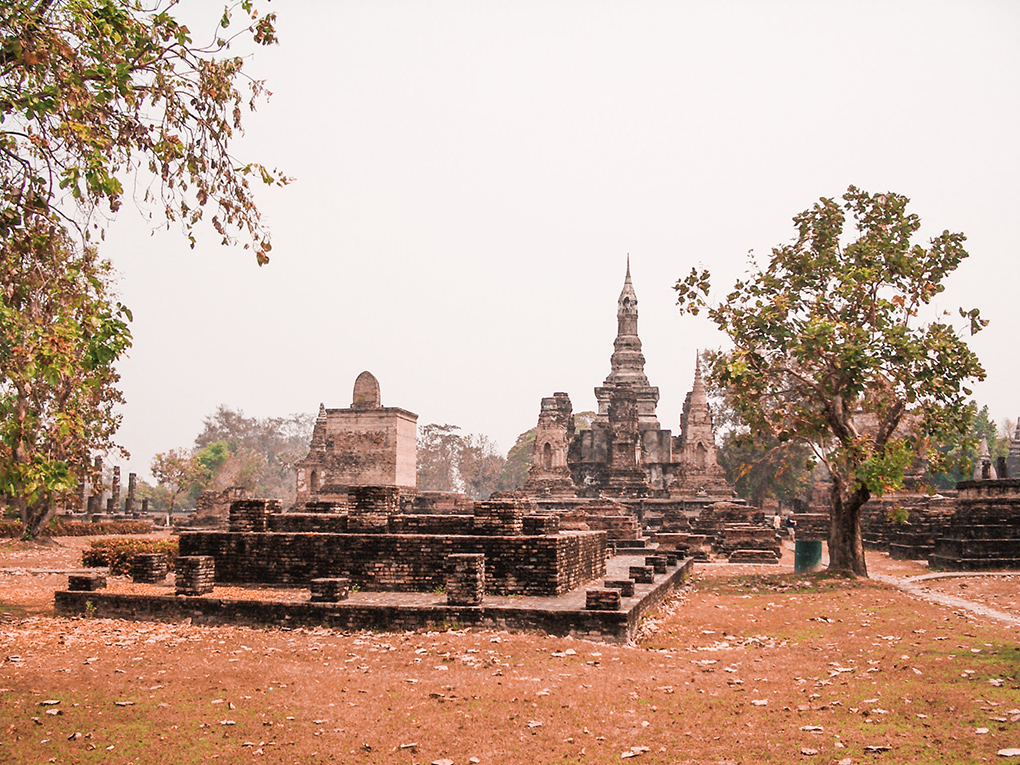 在这个古城内,最大的寺庙乃建于13世纪的玛哈泰寺(Wat Mahathat),由古老的城墙和沟渠环绕,庙里曾经建有200多座佛塔,如今多数只剩下残破的塔基。较为完整的有泰式风格的主塔,以及周围环绕的3座斯里兰卡风格的小塔和4座高棉风格的小塔。