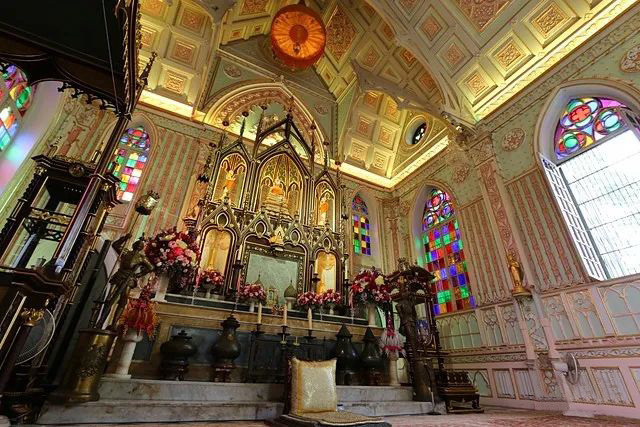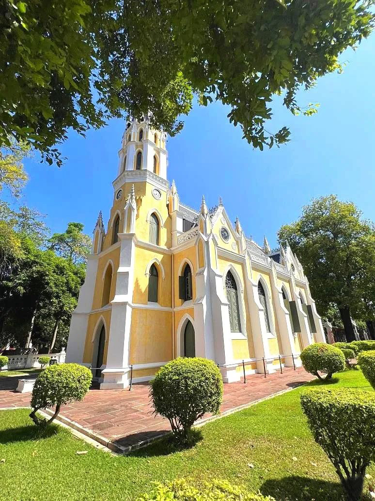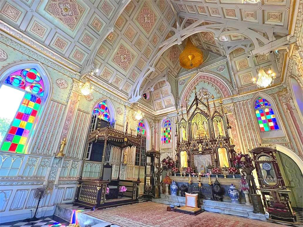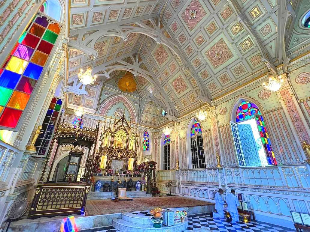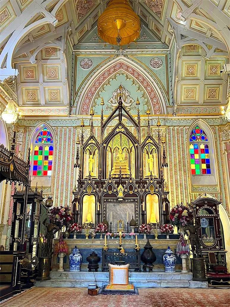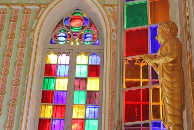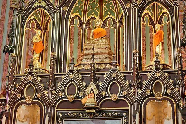 三层楼挑高的设计,开阔的空间感,搭配泰式佛教黄金色的摆设,欧式花窗玻璃与佛祖一同出现,完全没有违和感。这种风格不仅在泰国仅此一座,甚至在全世界也是独有的。