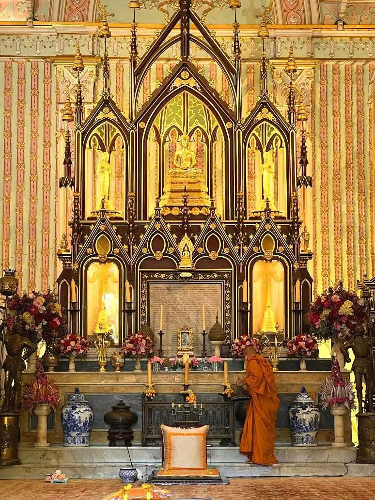 里面没有耶稣和圣母玛利亚的雕像,供奉的是大城时期造型的金色佛像;墙上欧式彩色玻璃虽然依旧,却不见括圣经故事与使徒神迹,取而代之的是泰皇拉玛五世的图像。
