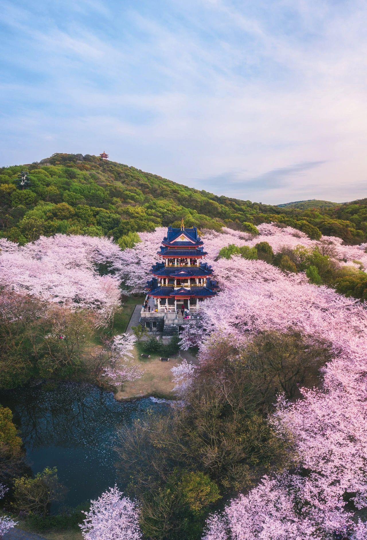 在千年古刹南京鸡鸣寺,一条樱花组成的粉色河流蜿蜒向北,一路流淌到玄武湖的桨声灯影;