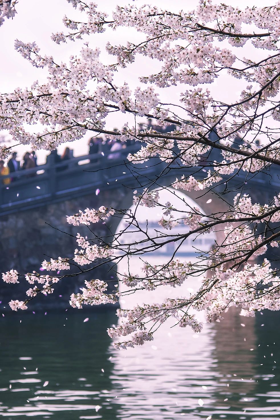 粉色樱花的花瓣雨,从桥头飘落在湖面上。| 视觉中国