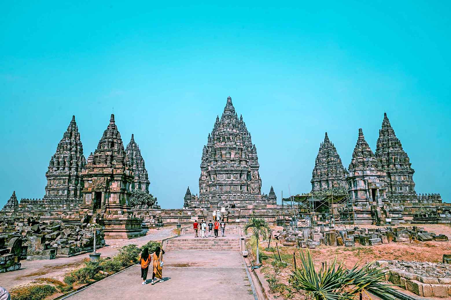 普兰班南建筑群乃印尼境内最大、最美丽的印度教庙宇,建于10世纪,由240座庙宇所组成,其中六座寺庙在广场中间巍峨耸立,分别供奉着三位主神——湿婆、毗湿奴和梵天及其坐骑,是印尼最大的湿婆神庙。