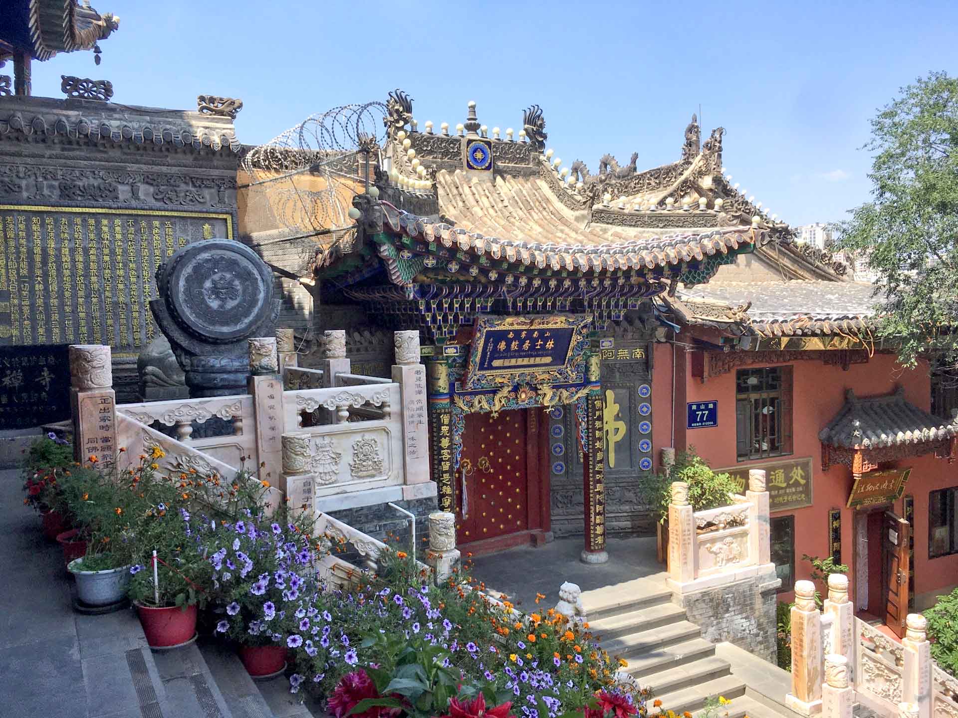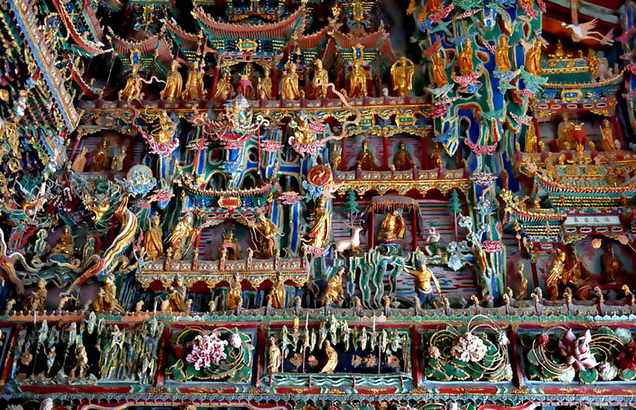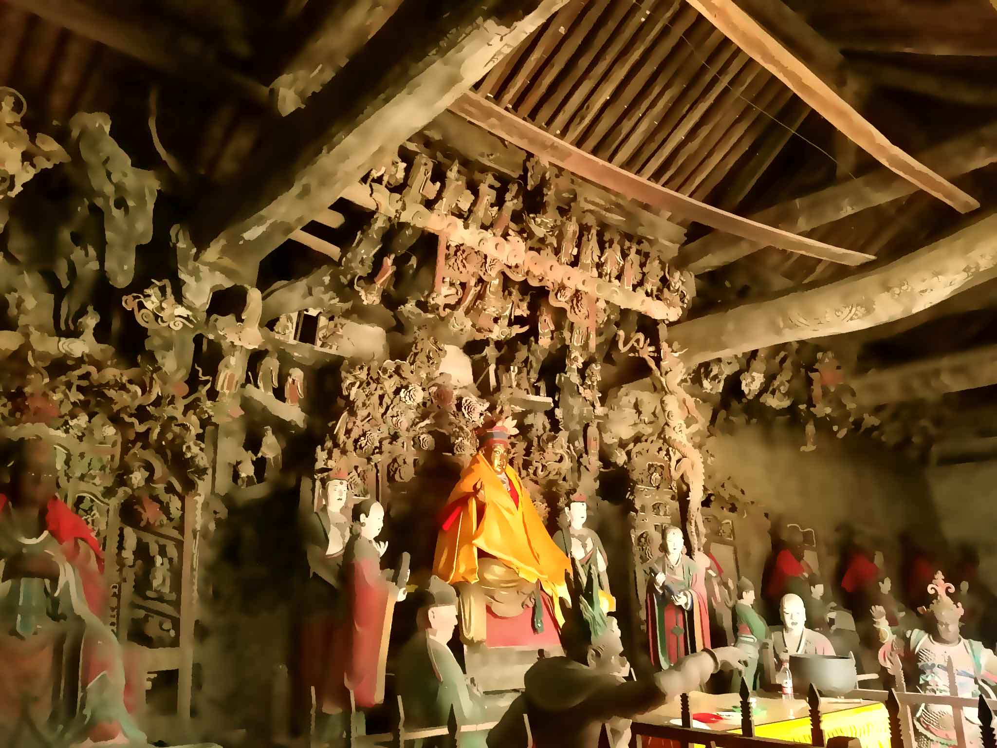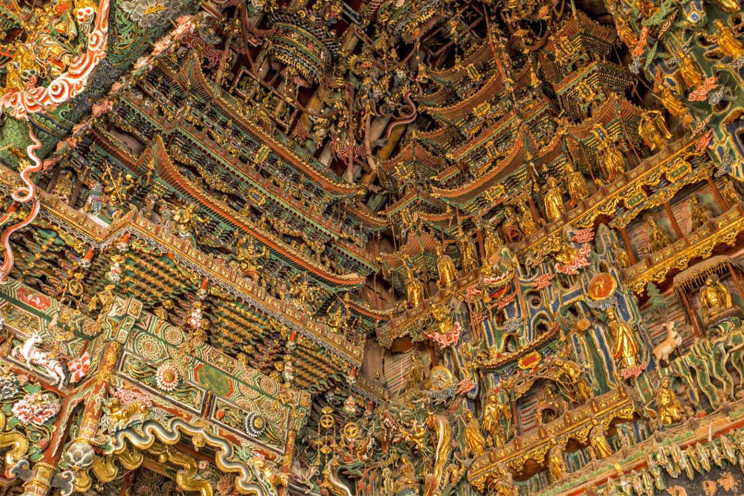 寺内分上、下两院,两院内有很多色泽明丽、造型生动的塑像,堪称明代彩塑中的精品。下院有无量殿、韦驮殿、左右厢房和前向掖门等建筑。无量殿坐西面东,内有数十尊铜佛和木雕天宫楼阁。上院左右分别为文殊殿、普贤殿,正中为大雄宝殿。大殿内,满布大型彩绘悬塑,正面横排着5个互通的佛龛,5尊主佛端坐其中,左右两侧10尊弟子侍立。殿内,有33层天宫楼阁,彩绘色泽艳丽,雕梁画栋。殿内悬塑众多,人物造型丰满、生动,内心世界刻画感人至深,是明代彩塑塑造精美,充满韵味的珍品,至今色泽依旧,成为明代彩塑艺术的宝库,真的只能用震撼来形容。