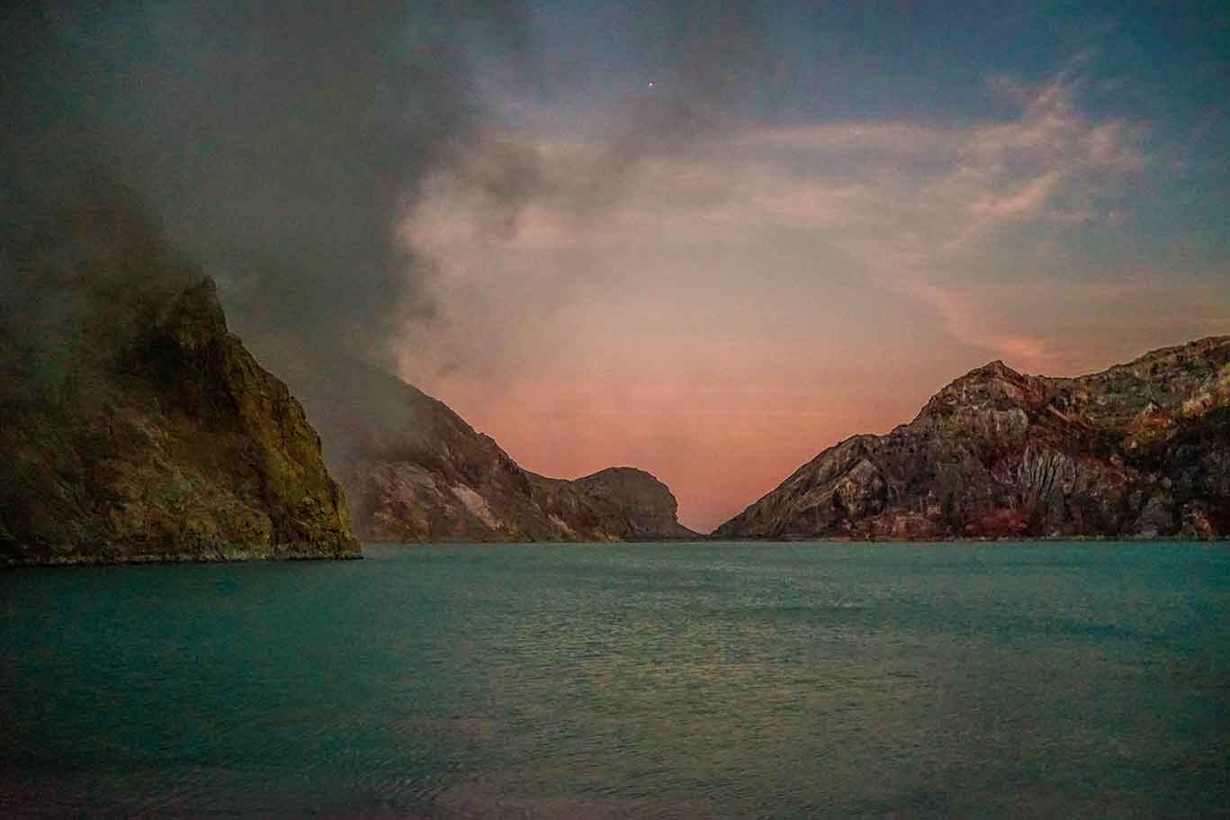 这时,第二个罕见现象也渐渐清晰起来—— 伊真火山湖。这个装满了碧蓝海水的火山湖,水的颜色是其极端酸度和高浓度溶解金属所导致。它也是世界上最大的高酸性湖泊。湖深200米,总面积达5.466公顷,犹如一颗蓝宝石嵌在山谷之中,随着日光和温度的变化,呈现出不同的色彩。