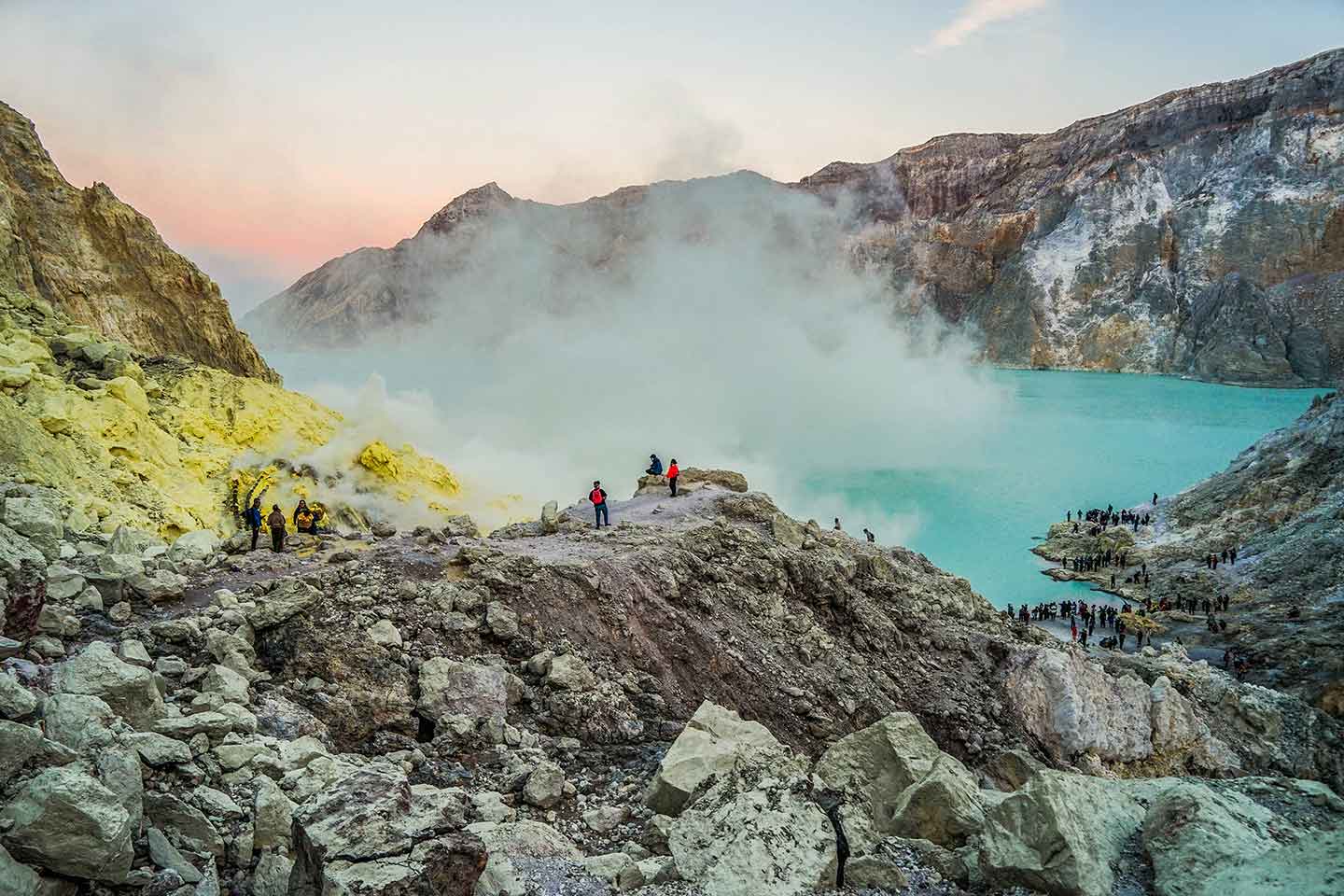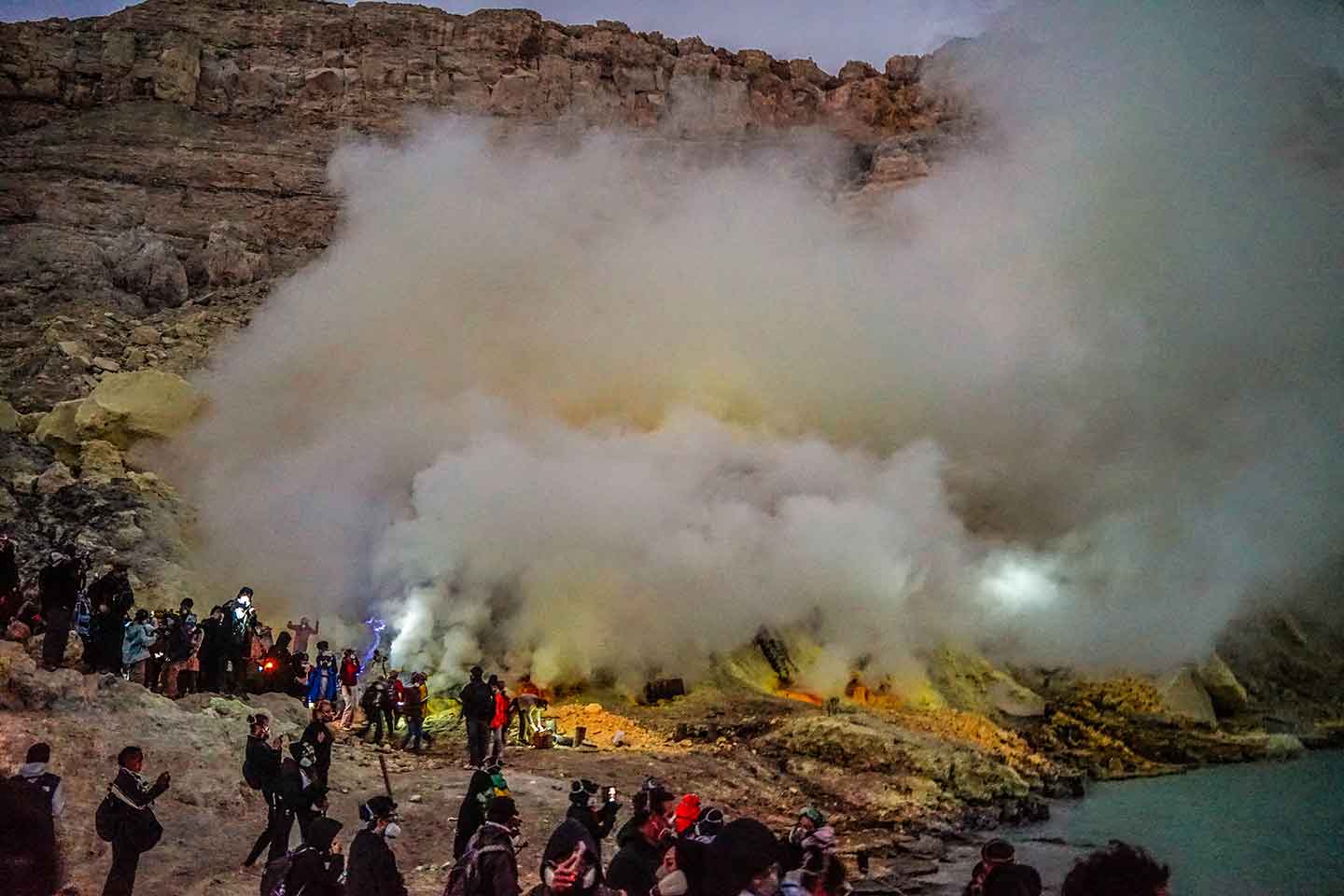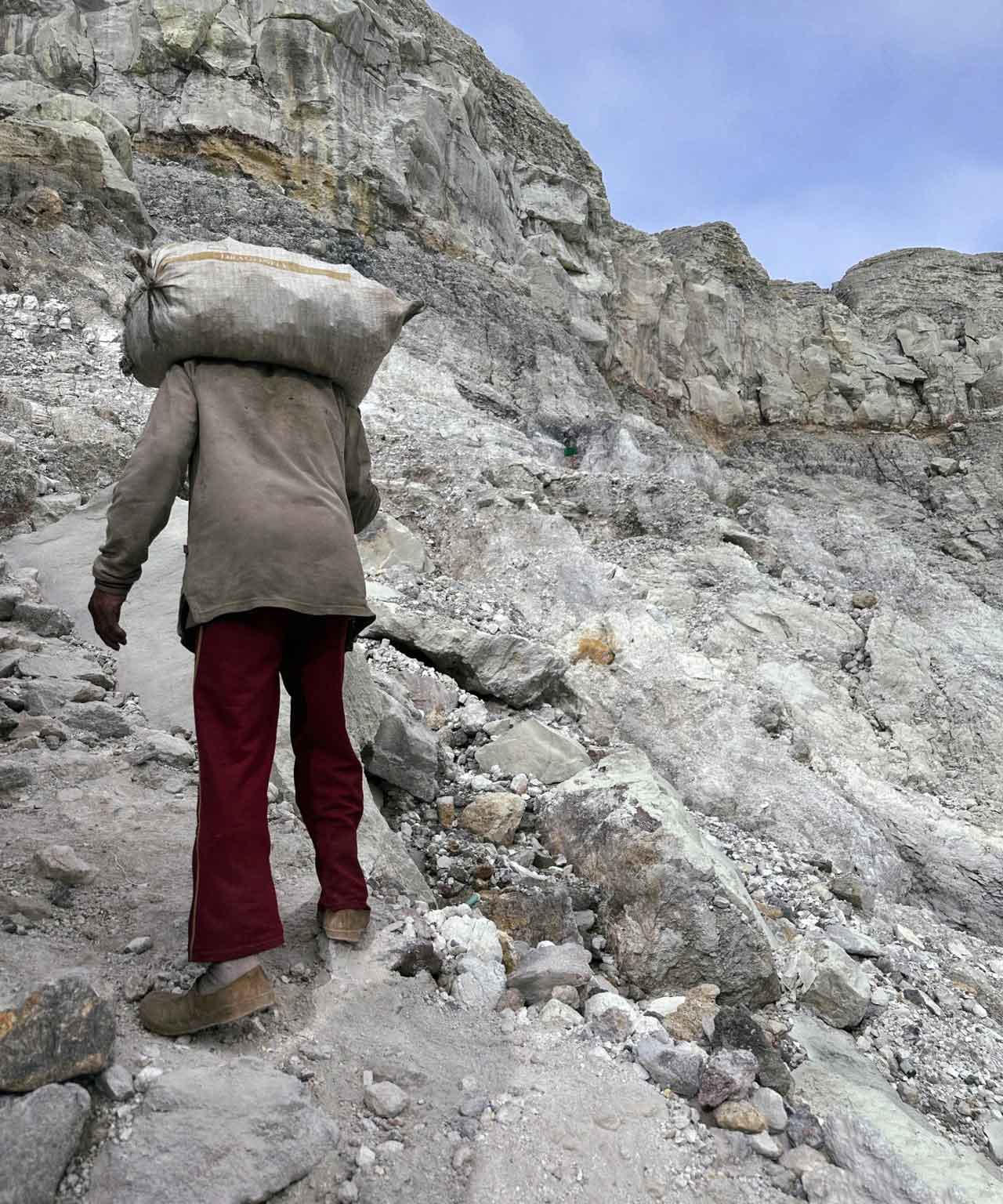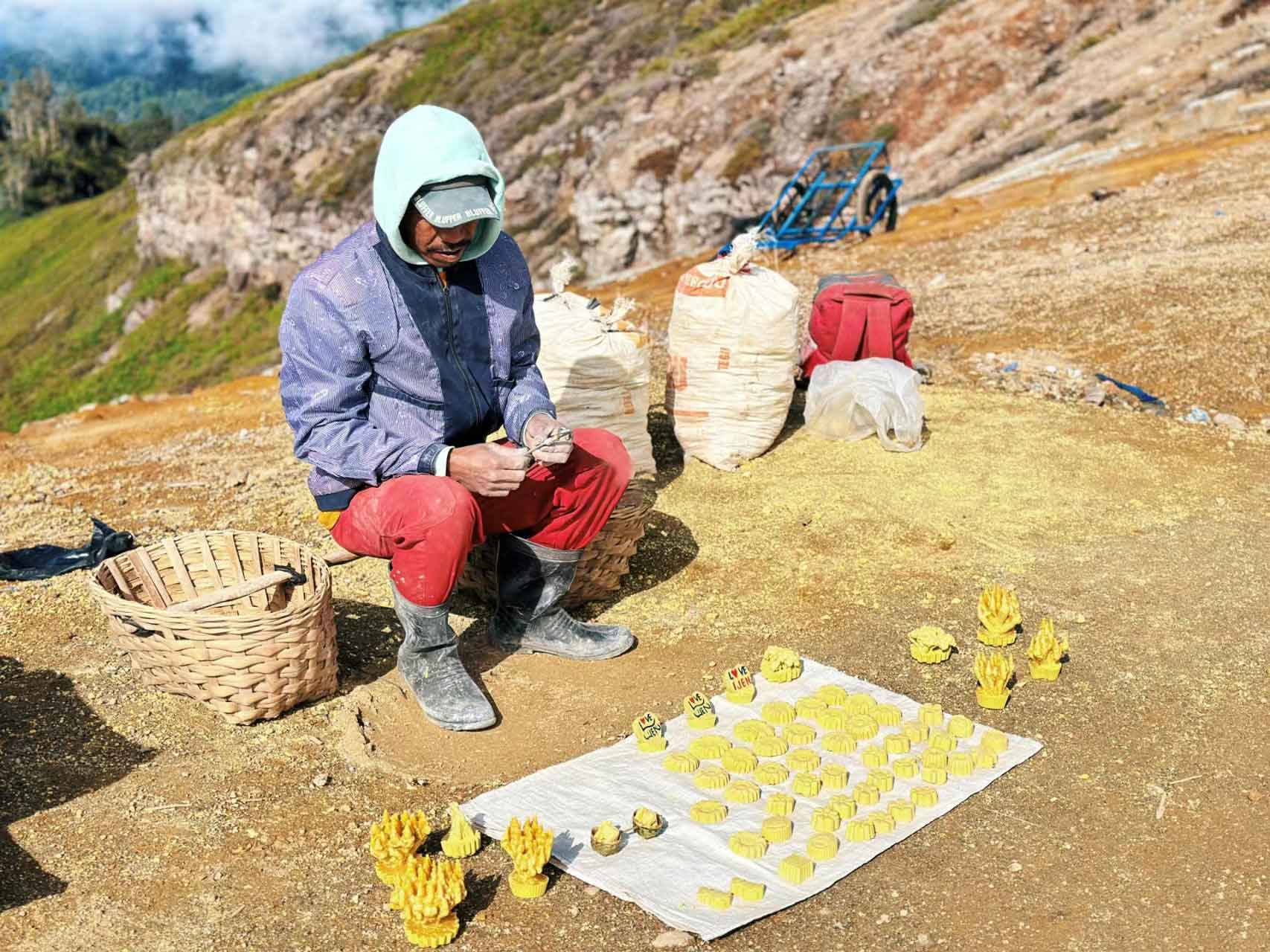 这里每天都有工人穿越火山口采集硫磺为生。由于长时间的工作,矿工每次都必须扛上50到70公斤的硫磺下山换取微薄的收入,约为10美元。为了谋生,他们牺牲了寿命,平均寿命不过30岁。一些矿工为了增加收入,用硫磺制作精美的摆设品来出售。
