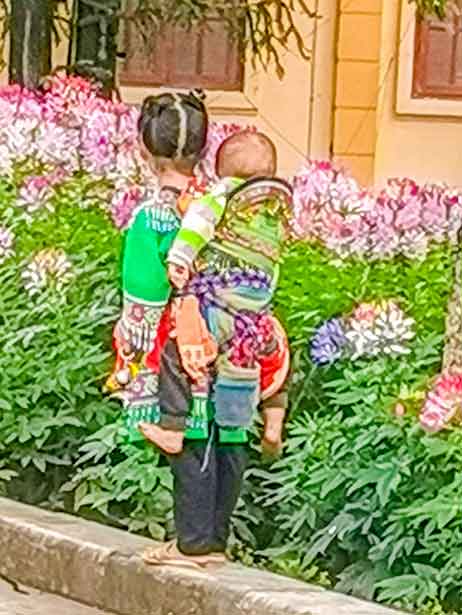 走在街上,所到之处都可以碰到兜售小饰物的当地少数民族孩童,最小四五岁,最大的七八岁,他们不断地纠缠游客乞讨或兜售纪念品,有些还背着他们刚出生的小弟弟或小妹妹,身上似乎没有洗过澡脏兮兮,都是不上学被家里强迫当赚钱工具,利用游客对孩童的同情心。