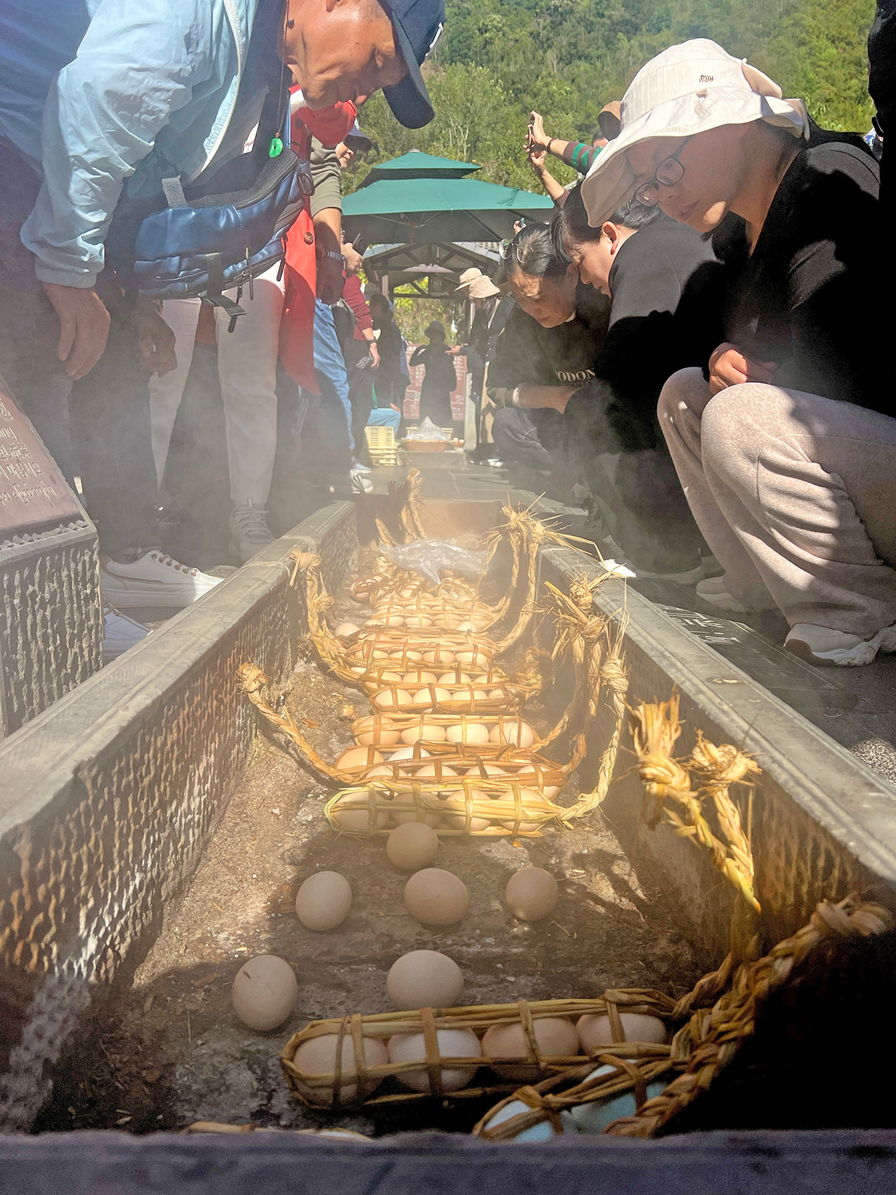 最令人驻足的,自是那口“大滚锅”:直径数米的泉眼沸水翻腾,温度常年超过90℃,八块石板围作八卦,恍如大地自设的丹炉。游客们笑着将串好的鸡蛋放入旁侧的气孔,不消片刻便熟了。